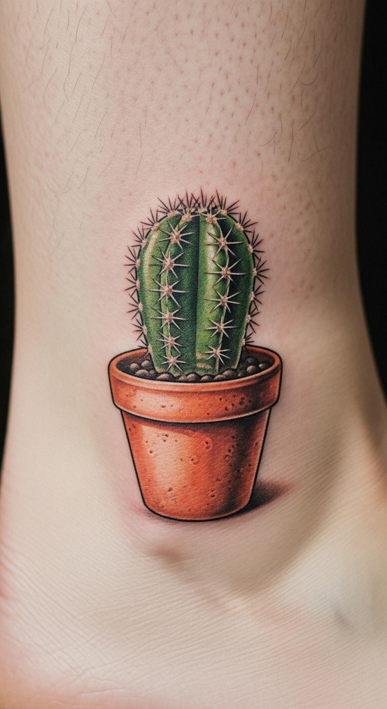 Potted cacti tattoos bring a homey feel to your ankle, like a plant in a pot. It’s about roots and growth. Cost around $100. Draw a pot with a simple sketch. Add details like soil. Ankle heals fast. Design stays with care. Make it personal with patterns. Use home creams. Quick session ahead. It represents stability.