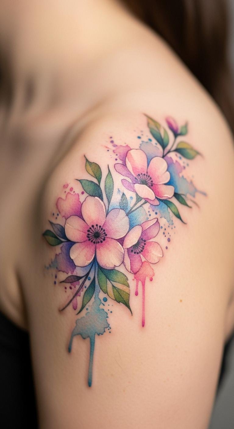 Watercolor flowers mix color and softness. See them on your shoulder as an artistic statement. Start by coloring simple flowers in a sketchbook. No expense needed for trials. Pick colors that match your wardrobe for cohesion. Free tools online help visualize blends. Get test sheets for about $2. Place where it complements your outfit, like your upper arm. Bold the element: blended hues for vibrancy. Local shops offer this for $70 onward. It’s a simple way to add flair.
