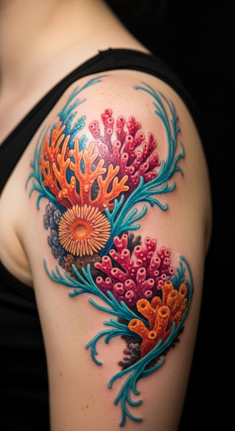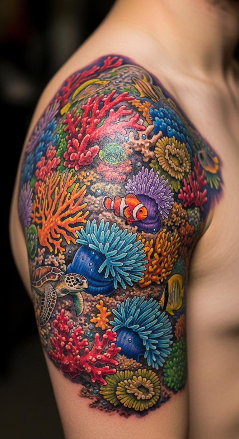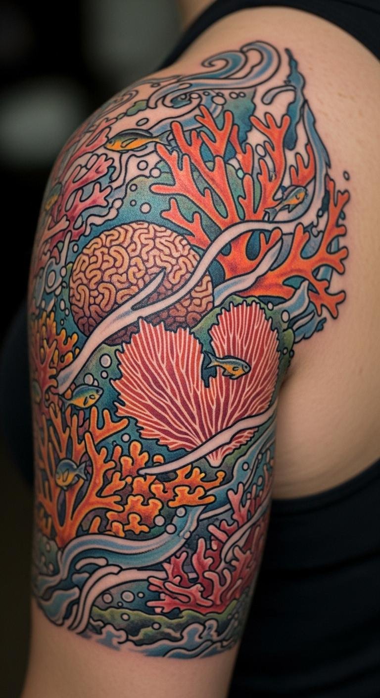 Bright colors bring coral reefs to life on your skin. Choose reds and oranges for that pop. Place it on your shoulder for easy viewing. Find an artist online who specializes in color work; they might cost $200. Sketch ideas at home with colored pencils to plan. Bold this: use bold colors to match your style. Add small fish for extra flair. This design pops in photos, so try it for events. Keep costs down by going small. Apply sunscreen daily to protect the ink. You’ll enjoy the vibrancy with simple touch-ups every few years.