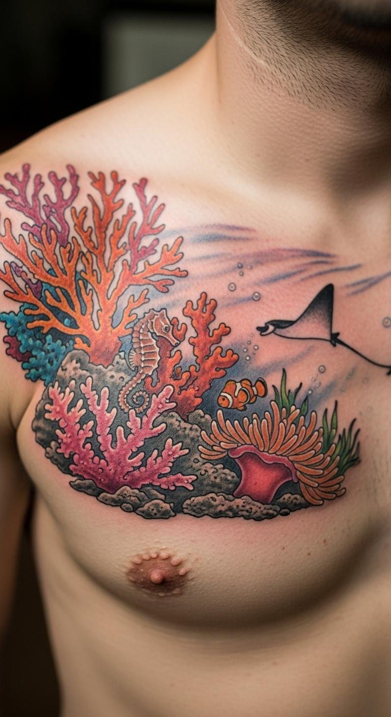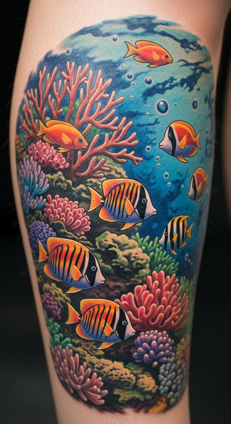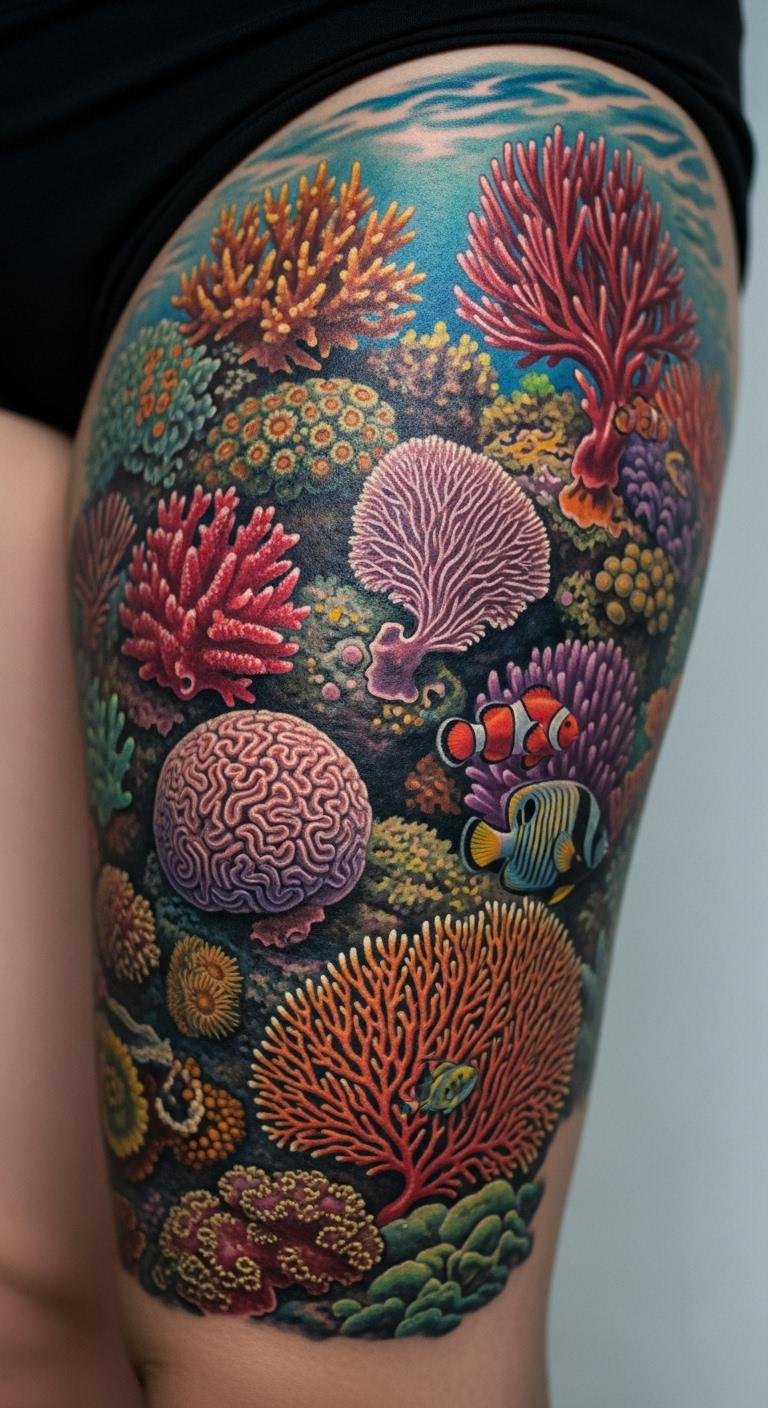 Bright colors bring coral reefs to life on your skin. Choose reds and oranges for that pop. Place it on your shoulder for easy viewing. Find an artist online who specializes in color work; they might cost $200. Sketch ideas at home with colored pencils to plan. Bold this: use bold colors to match your style. Add small fish for extra flair. This design pops in photos, so try it for events. Keep costs down by going small. Apply sunscreen daily to protect the ink. You’ll enjoy the vibrancy with simple touch-ups every few years.