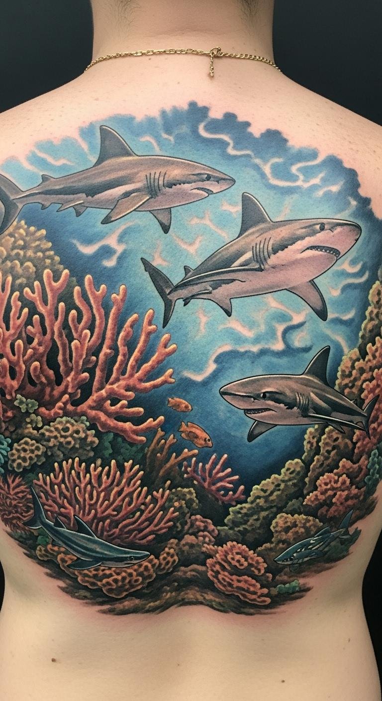 Sharks with coral add edge. Place on your back for impact. This design tells a tale. Artists ask $180. Sketch sharks simply. Bold this: pair with sharks for thrill. Build it step by step.