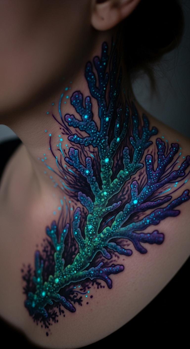 Bioluminescent coral mimics night glow. Try your neck for mystery. Use creative shading. Artists charge $220. Imagine it with lights. Bold this: inspire with glow effects. A unique pick.