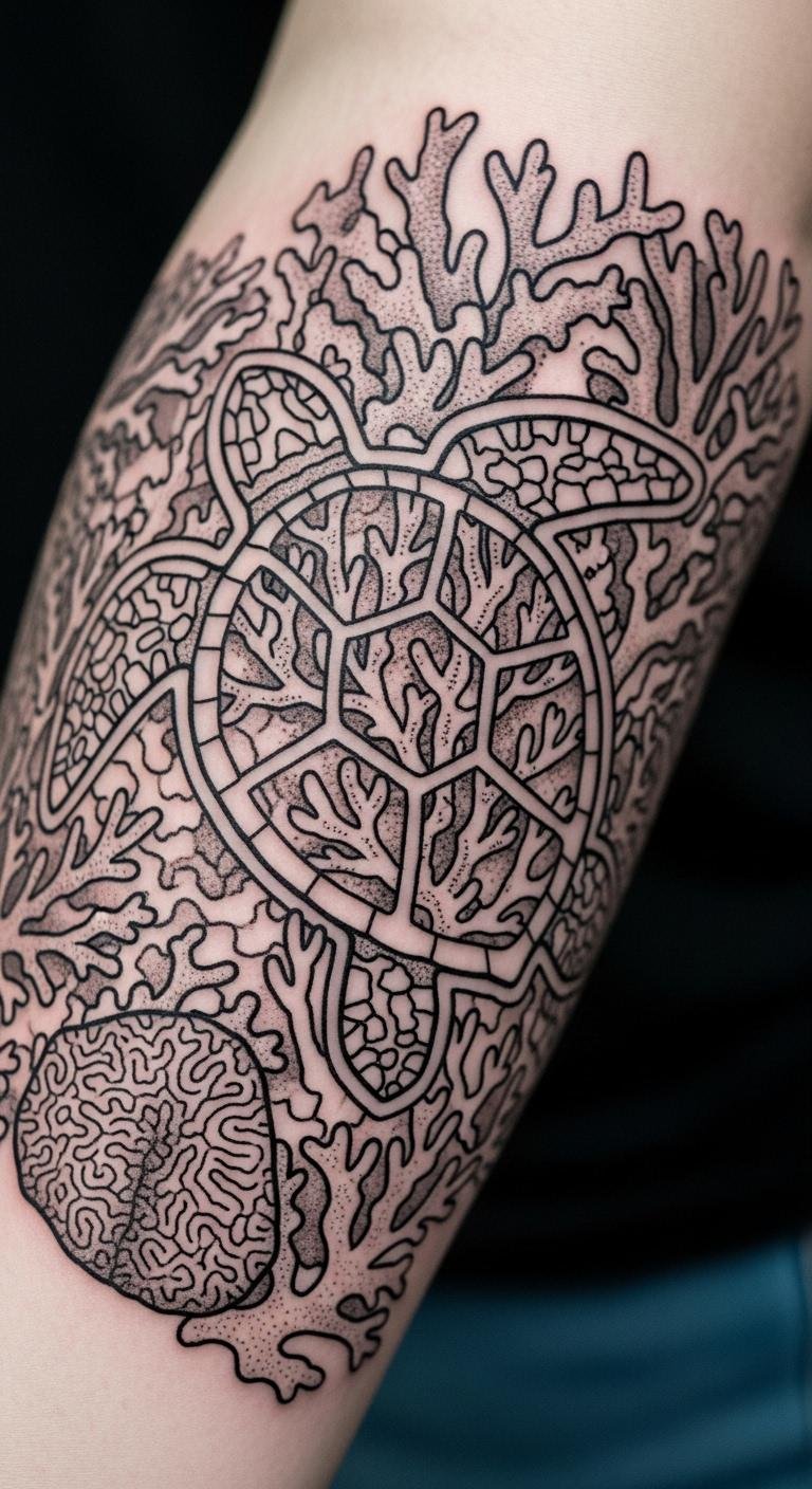 Pair coral with a sea turtle for a story of the ocean. Put it on your arm for balance. This combo shows protection and growth. Look for artists in your area who do animal motifs; expect $150 fees. Draw the turtle and coral together on paper as a fun DIY step. Bold this: add the turtle for meaning. Keep the size medium to save money. Use lotion regularly to maintain it. This tattoo works well in sleeves, so plan ahead. Sessions take about two hours total.
