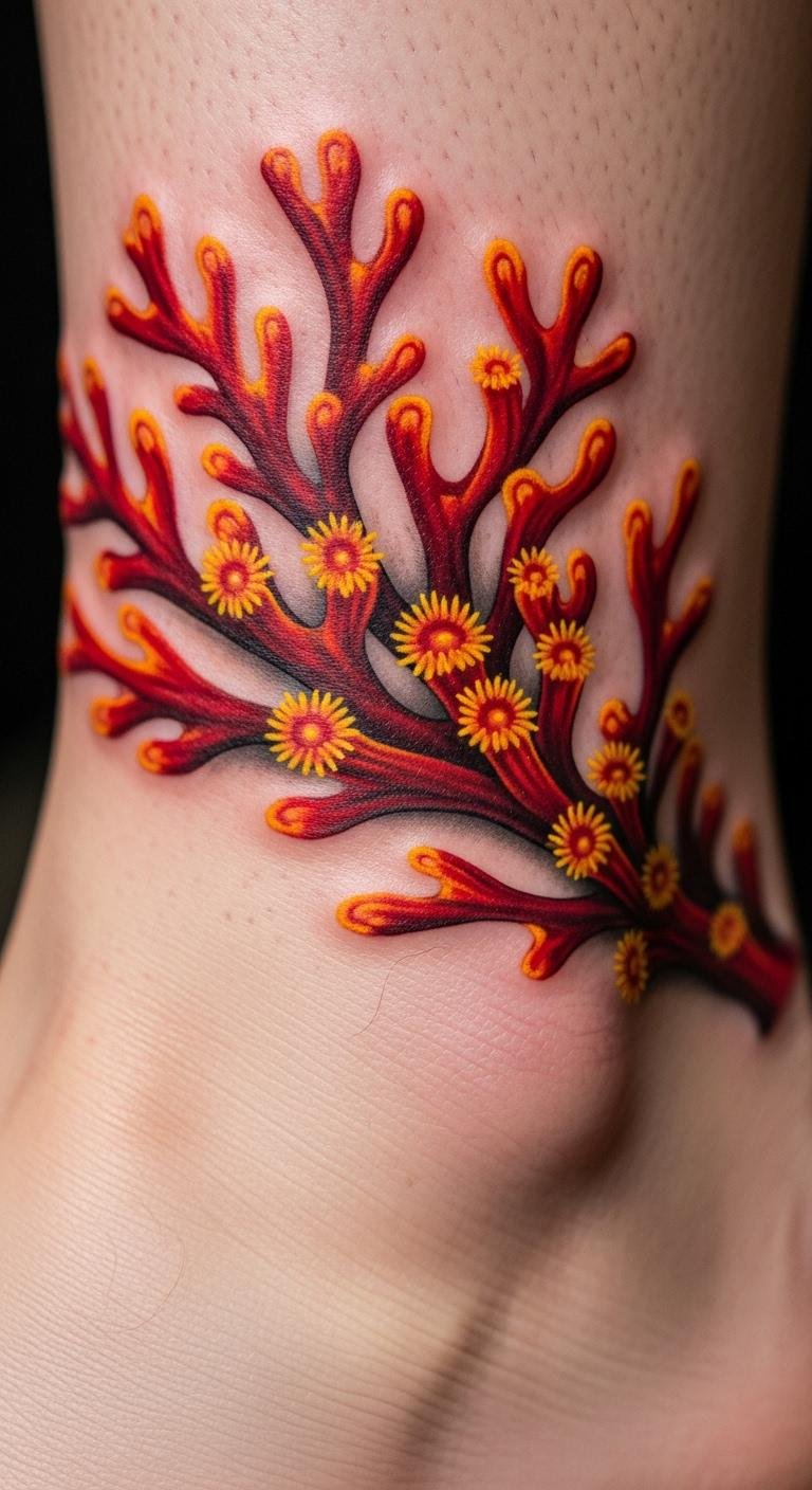 Red and orange coral bursts with energy. Try your ankle for subtlety. These colors draw attention. Artists charge $100. Test colors with markers. Bold this: use red and orange for pop. Stays bright.