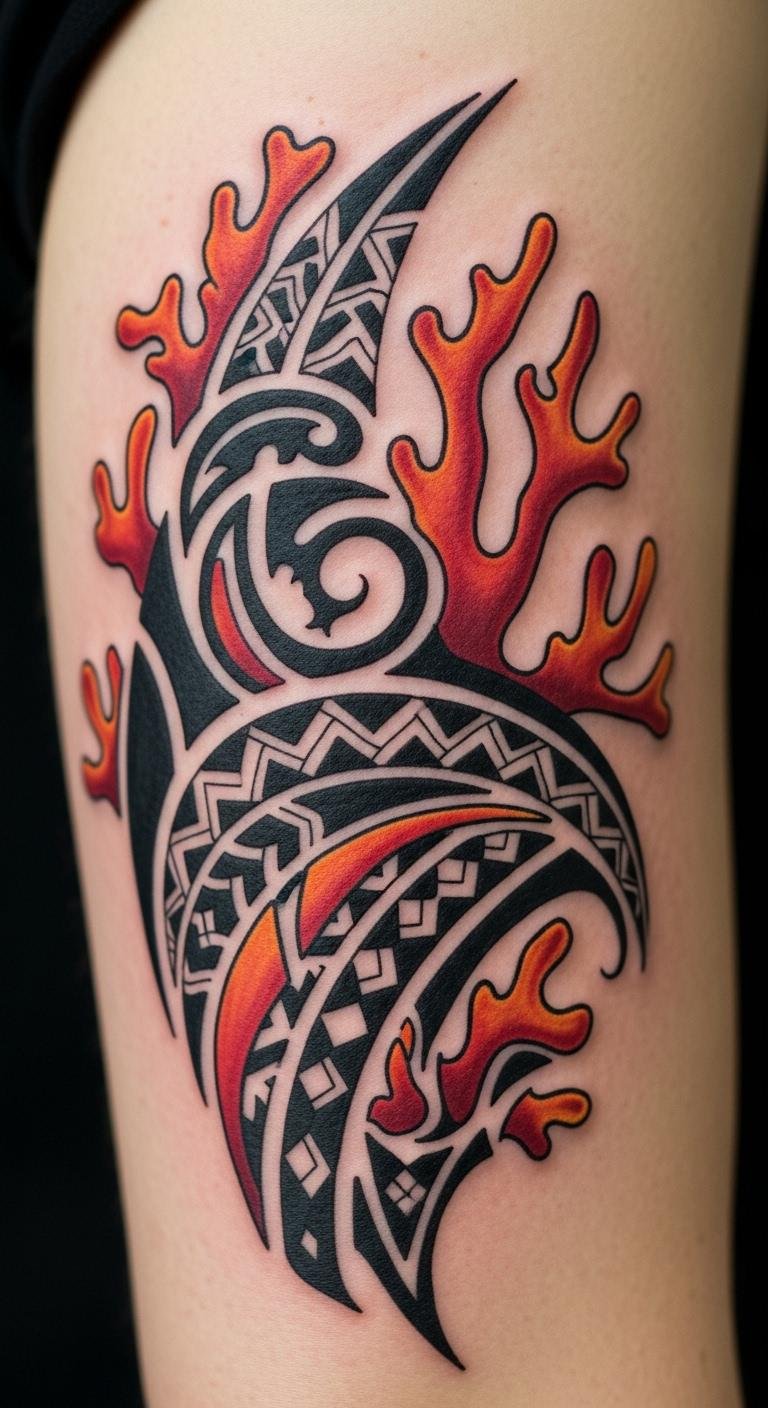 Geometric twists make coral feel fresh. Place it on your back for a big canvas. Mix triangles with coral forms. Find artists who blend shapes; costs are around $180. Create a grid sketch at home for ideas. Bold this: try shapes to modernize. This design fits various spots. Use simple tools like rulers for DIY planning. The lines stay clear with good aftercare.