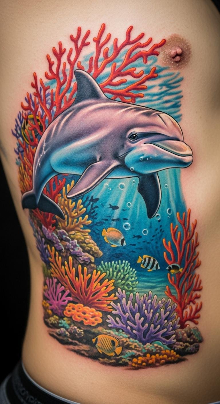 Dolphins with coral add joy. Put on your side. This design swims with fun. Expect $160. Draw dolphins simply. Bold this: pair with dolphins for play. Lighthearted and cool.