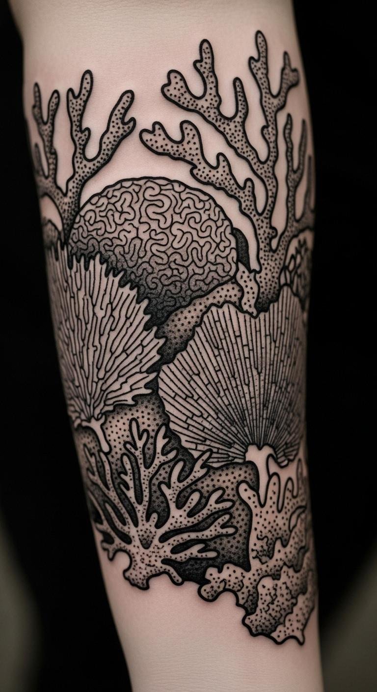 Solid black ink gives coral a bold edge. Try this on your forearm for strength. It draws from old styles but feels modern. Search for blackwork experts nearby; prices start at $100. Practice shading at home with a marker. Bold this: go black for longevity. The ink holds up well over time. Add geometric shapes if you want. This option hurts less on thicker skin. Book a short appointment to start.
