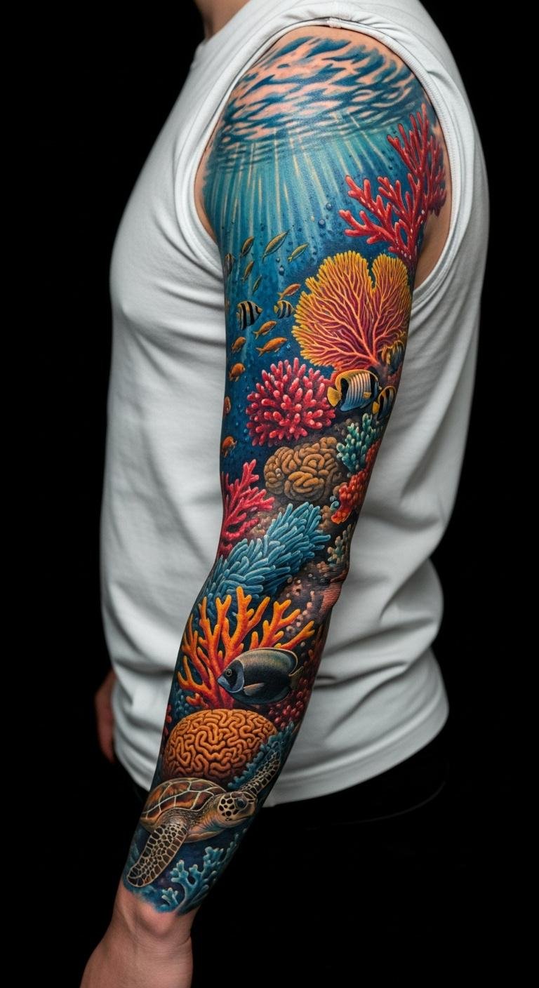 Build a sleeve around coral for a full story. Start on your arm with colors and creatures. It grows over time. Artists charge $300 or more for sleeves. Plan sections at home with drawings. Bold this: layer coral in the design. Add waves or fish gradually. Break sessions into hours to manage cost. This piece shows off your interests.