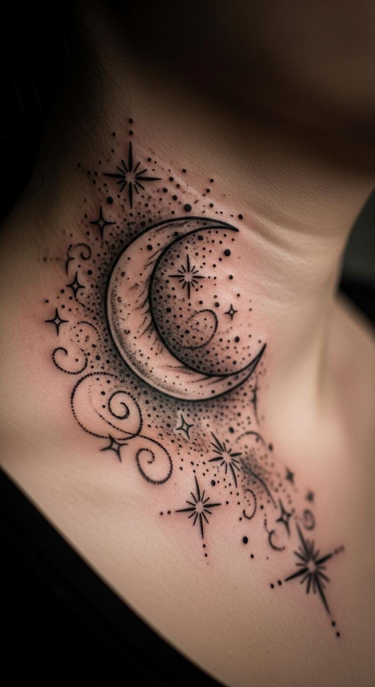 Surround your crescent moon with stars for a cosmic feel. This design brings the night sky to life. Use dot stickers at home to plan it. Studios price it at $130. Locate on your neck for a discreet option. Starry combo enhances the moon’s magic, great for stargazers. Experiment with glow sticks for a fun preview. Black and white ink fits fair skin well. The tattoo takes 40 minutes. Apply lotion for simple care. This idea stays affordable and inspiring.