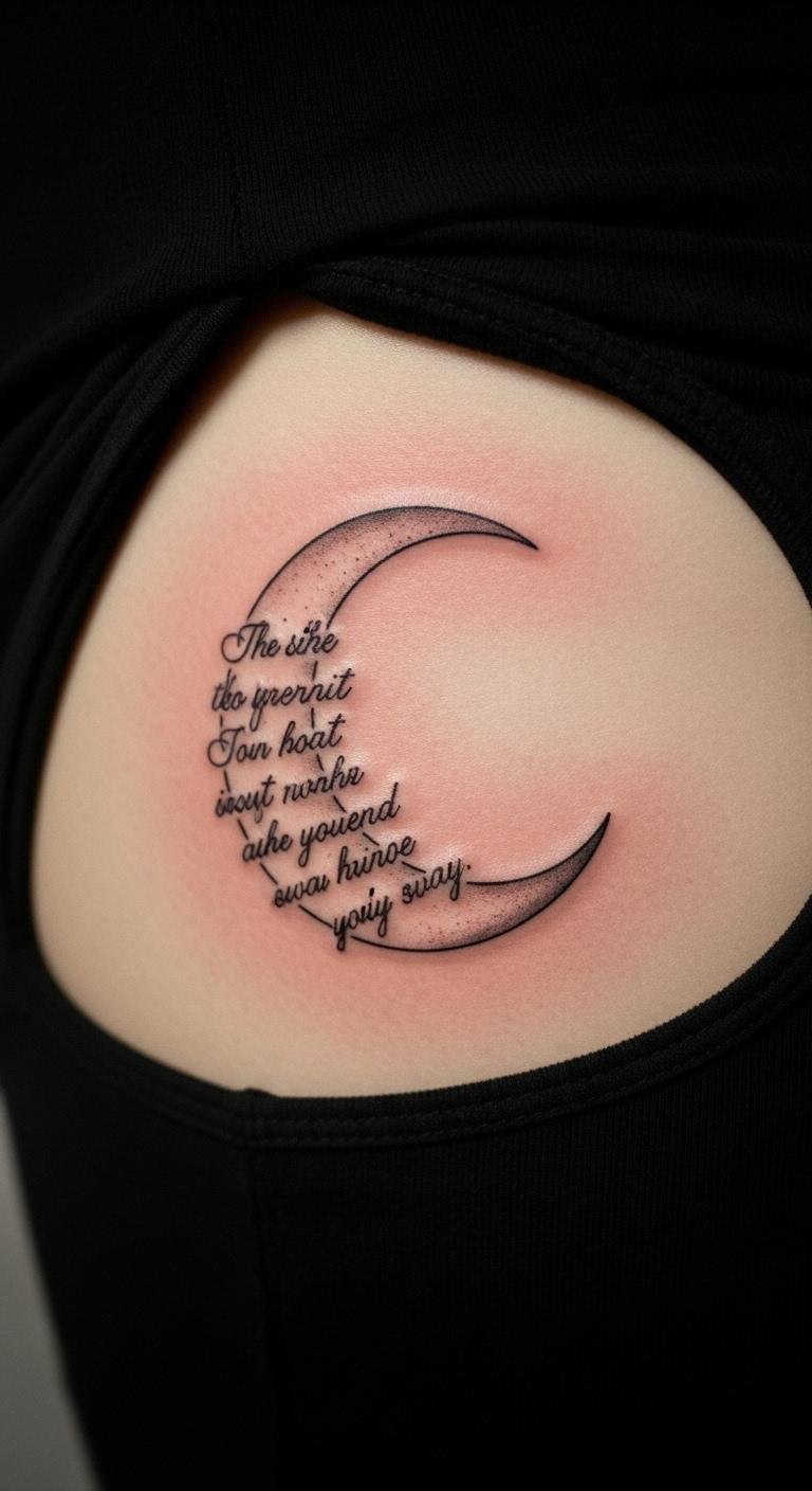 Incorporate a short quote with your crescent moon for added depth. This makes your tattoo truly yours. Write quotes on paper to match the design. Expect $110 for basic work. Place on your ribcage for privacy. Quote integration personalizes the moon, linking to your story. Try handwriting practice at home. Black ink ensures readability on light skin. Sessions are quick, about 30 minutes. Use soap for daily care. This approach adds value without extra expense.