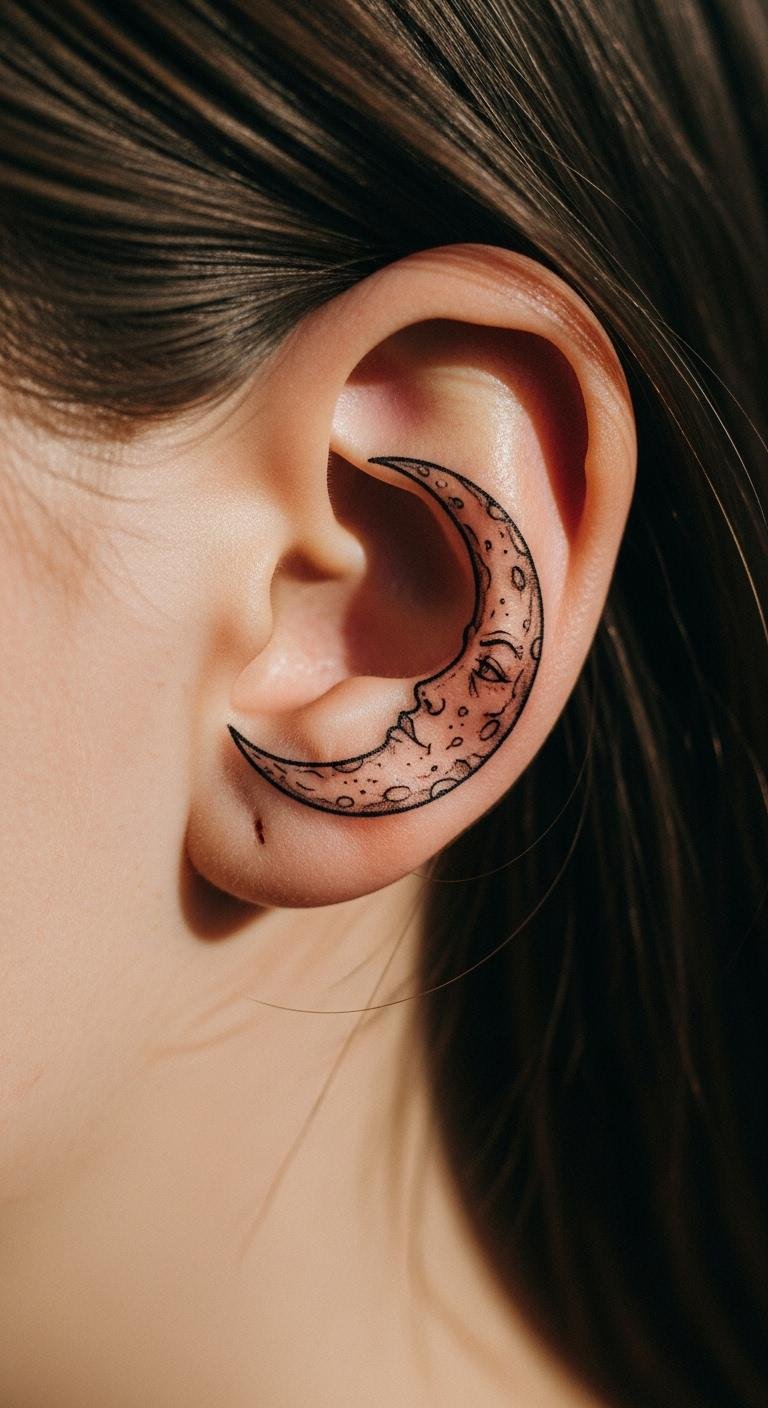 Hide a crescent moon behind your ear for a secret touch. This area adds a playful element to your look. Use ear templates for home planning. Artists charge $80 for small sizes. Behind-the-ear keeps it subtle, perfect for professionals. Test with earrings. Ink choices vary by skin tone. Sessions are brief, 15 minutes. Use cotton for gentle care. This design is easy on the wallet.
