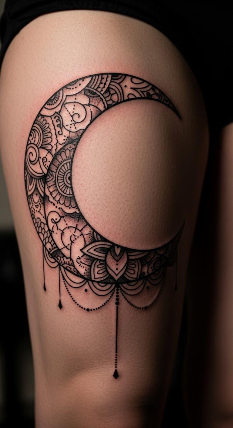 Picture a crescent moon wrapped in mandala swirls for a spiritual vibe. This idea adds depth to your tattoo, turning it into a personal emblem of balance. Draw inspiration from online freehand guides; trace patterns on your skin with washable markers for a trial run. Find budget artists online for designs under $150. Aim for medium size on your shoulder to blend with clothing. Mandala elements bring a boho feel, perfect for nature themes. Mix in simple dots or circles at home to experiment before the appointment. Choose black ink for clear lines on medium skin tones. This setup works well for daily wear, hiding under shirts when needed. Keep sessions short to manage discomfort, and use household lotion for initial care. The result? A timeless piece that reflects your inner world without breaking the bank.