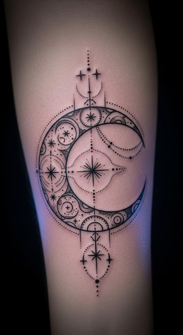Go for a tribal twist on the crescent moon with geometric shapes. This style adds edge to your tattoo collection. Draw simple patterns at home using graph paper from your desk. Find artists for under $180 who focus on line art. Place it on your shoulder for a strong visual. Geometric crescent draws from cultural roots, making it unique. Experiment with string art as a DIY stand-in. Black ink works best on various skin tones for longevity. Sessions run about an hour, with minimal prep needed. Keep it clean with alcohol wipes for easy maintenance. This design offers personality at a reasonable price.