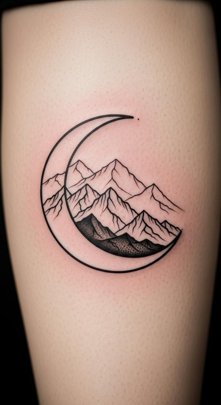 Add mountains to your crescent moon for an outdoor adventure feel. This design suits hikers who want a nod to exploration. Start by drawing peaks under the moon on plain paper; free online tutorials make it easy. Expect to pay $100–$150 at a nearby studio. Position it on your calf for a discreet yet bold statement. Mountain scene adds nature vibes, enhancing the moon’s mystery. Use stickers or henna for a cheap home trial. Go with black ink on medium skin for visibility. The tattoo process is straightforward, taking less than two hours. Simple care, such as moisturizing with aloe, helps it heal. This idea keeps things affordable and personal, blending your passions into one piece.