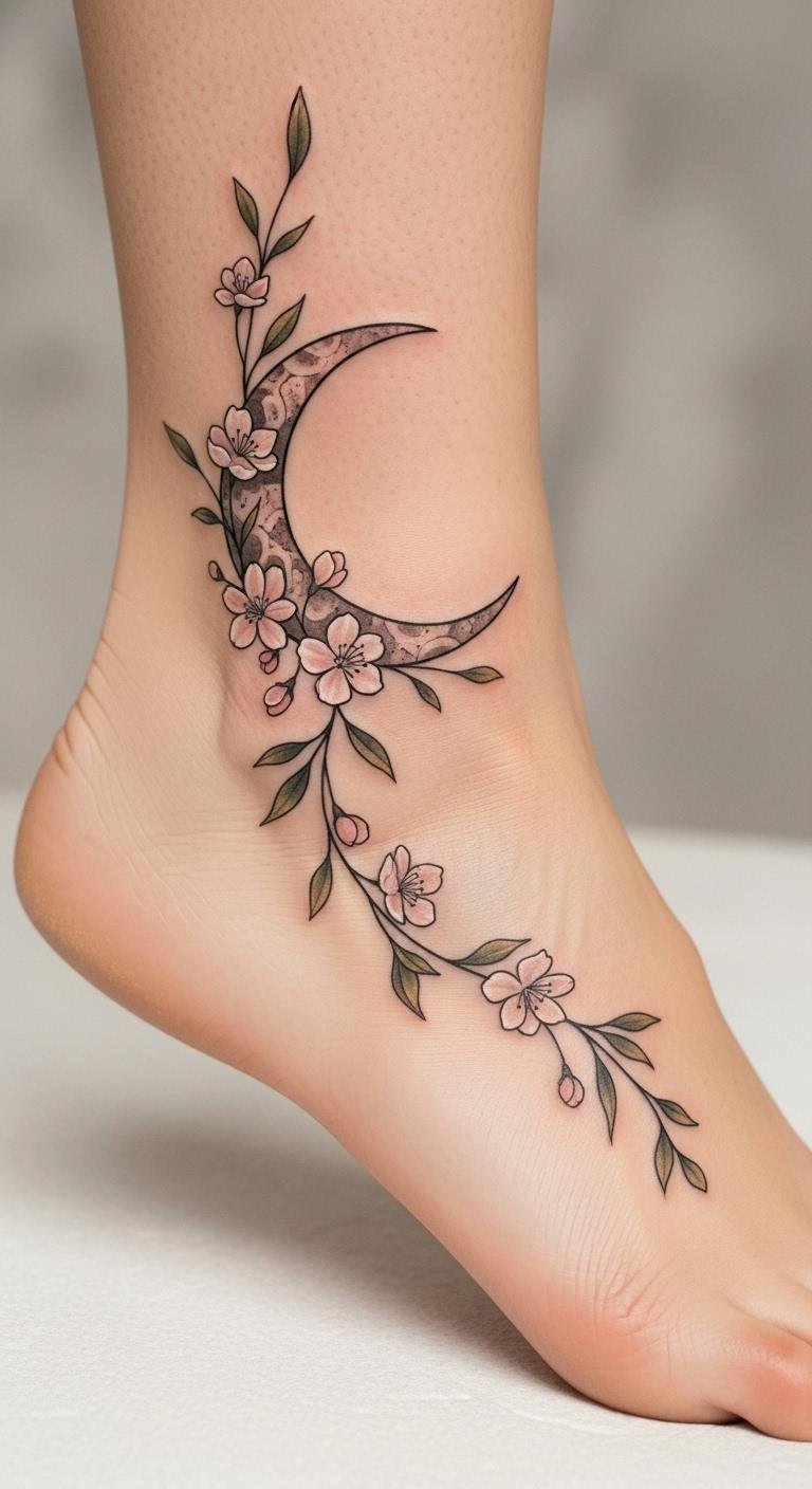 Wrap your crescent moon in flowers for a boho touch. This tattoo brings a fresh, feminine energy to your body art. Practice with flower sketches on your phone; free drawing apps provide templates. Studios charge about $120 for this style. Put it on your ankle for a subtle accent. Floral elements make it versatile, ideal for personal stories. Try temporary designs at home with markers to preview. Select blue ink for a pop on fair skin. Appointments last around 45 minutes, so stay comfortable. Use gentle soap for care to avoid irritation. This approach lets you express creativity without high costs, perfect for everyday wear.