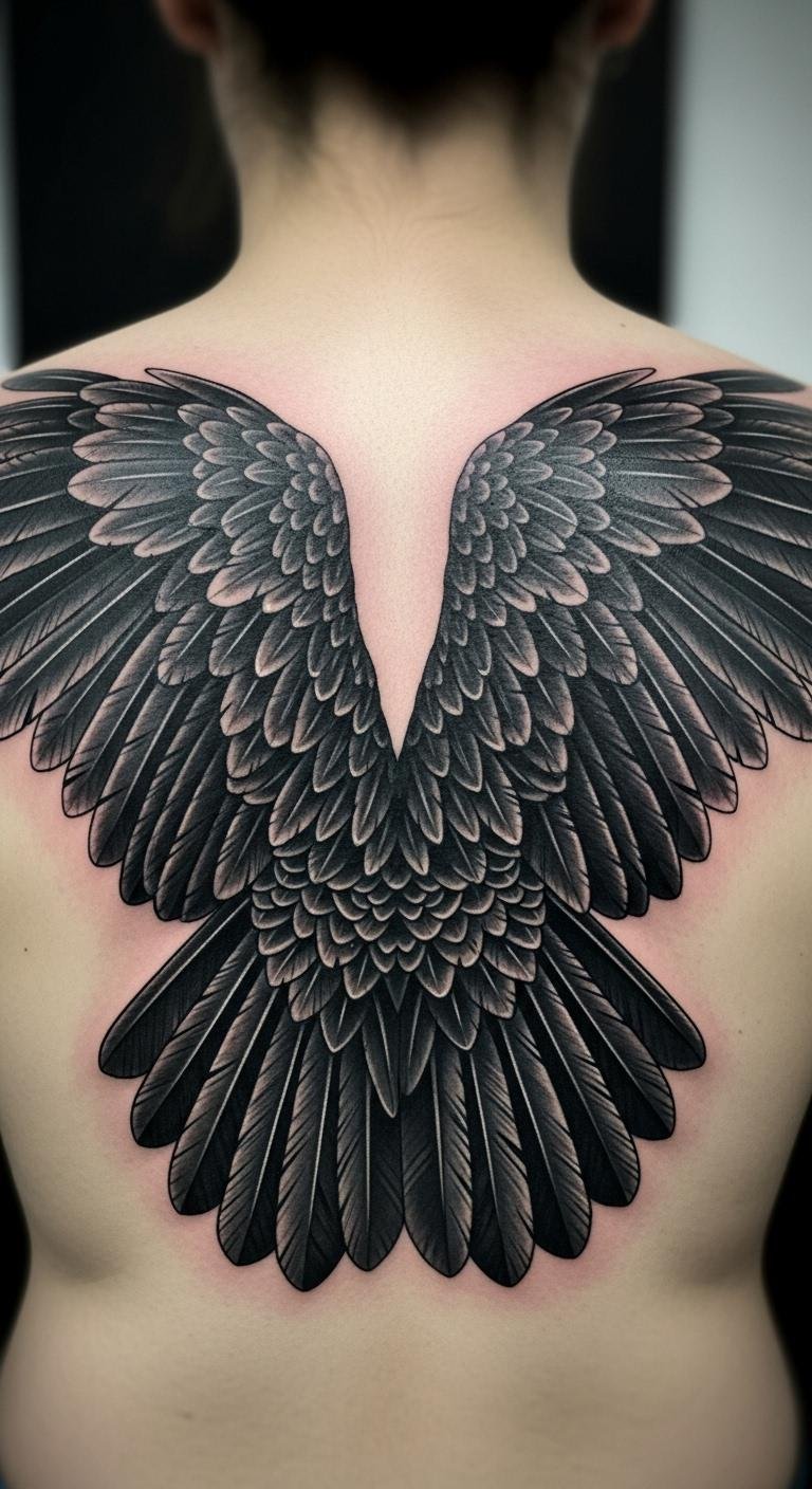 Think of wide crow wings, symbolizing freedom and flight. It’s empowering and vast. Outline wings on paper. Measure span with string. Find free wing templates. Go large but affordable. Back placement suits it. Draw with pastels first. This tattoo lifts spirits. Keep details minimal.