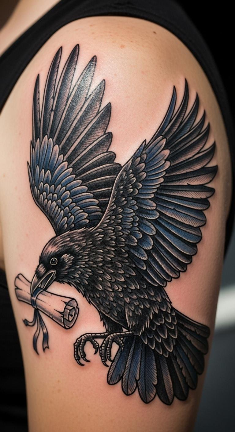 Envision a crow gripping a scroll, symbolizing secrets and messages. It’s all about hidden meanings. Jot down your message on paper first to personalize it. Use string as a stand-in for the scroll in sketches. Grab affordable printable stencils online for practice. Choose basic ink colors to stay within budget. Place it on your back for a dramatic reveal. Try drawing with markers at home to refine the idea. This tattoo makes a great tribute. Keep details simple to avoid high costs.