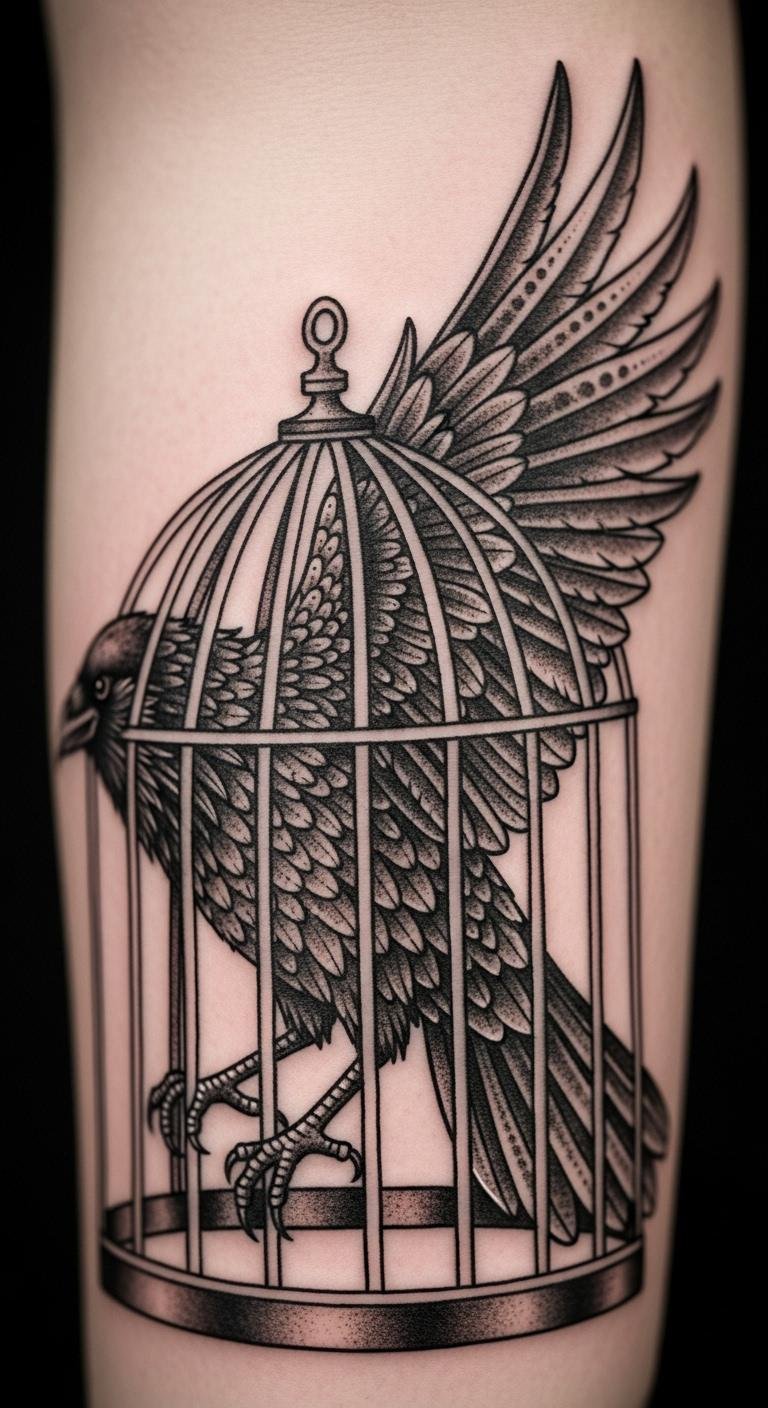 Think of a crow trapped but with one wing out, showing escape and hope. It tells a story of change. Draw a cage using straight lines on paper. Add the wing with curved strokes. Explore free narrative art resources. Use simple shading for budget reasons. Place it on your shoulder for meaning. Practice with charcoal pencils you already own. This tattoo reflects personal growth. Keep it compact to save money.