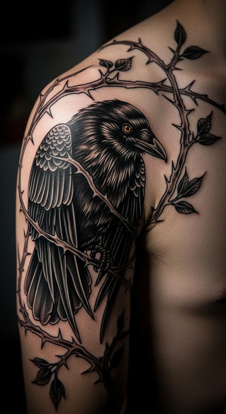 Envision a crow wrapped in thorny branches, symbolizing strength and resilience. It’s raw and powerful. Sketch branches with jagged lines. Use real twigs for reference. Check out free tattoo flash online. Stick to black ink for economy. Arm placement makes it visible. Test with drawing ink at home. This design empowers you. Avoid extras to keep costs low.