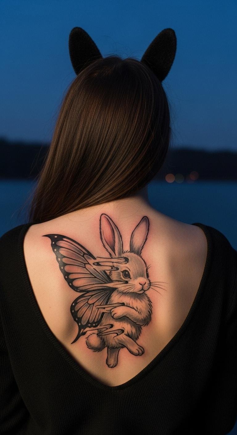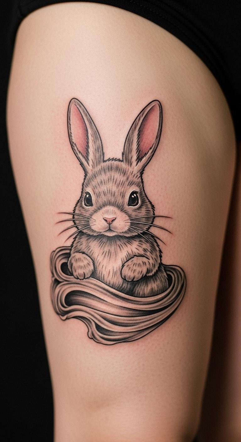 A black and grey bunny tattoo offers classic appeal. See a shaded rabbit with depth. It’s versatile for any setting. Try your back for discretion. Artists often price these lower, around $100. Experiment with graphite drawings at home. Free tutorials online help with shading. This saves on consultations. Black and grey bunny ages well. Use eye shadow for a temporary test. Make it practical.