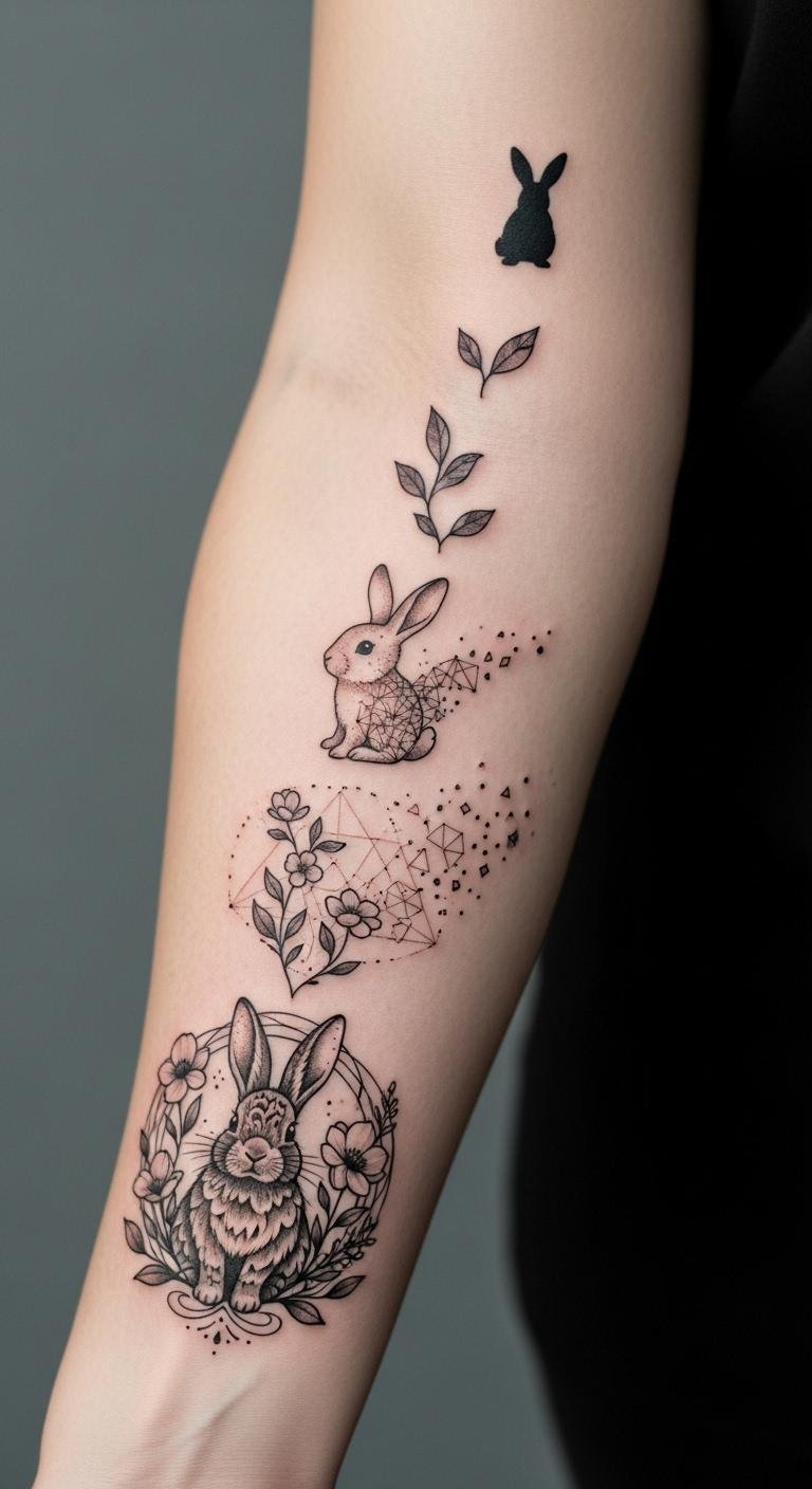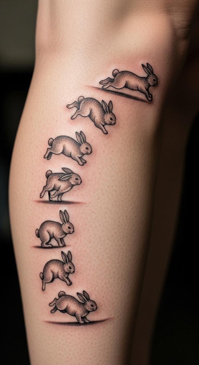 Hopping bunny sequence tattoos show movement. Imagine a series of jumping rabbits. It’s dynamic and lively. Put on your leg. Sequence artists charge $120. Sketch sequences with storyboards at home. Online animation tools assist. Build flow. Hopping bunny sequence energizes. Use flipbooks for tests. Hop into fun.
