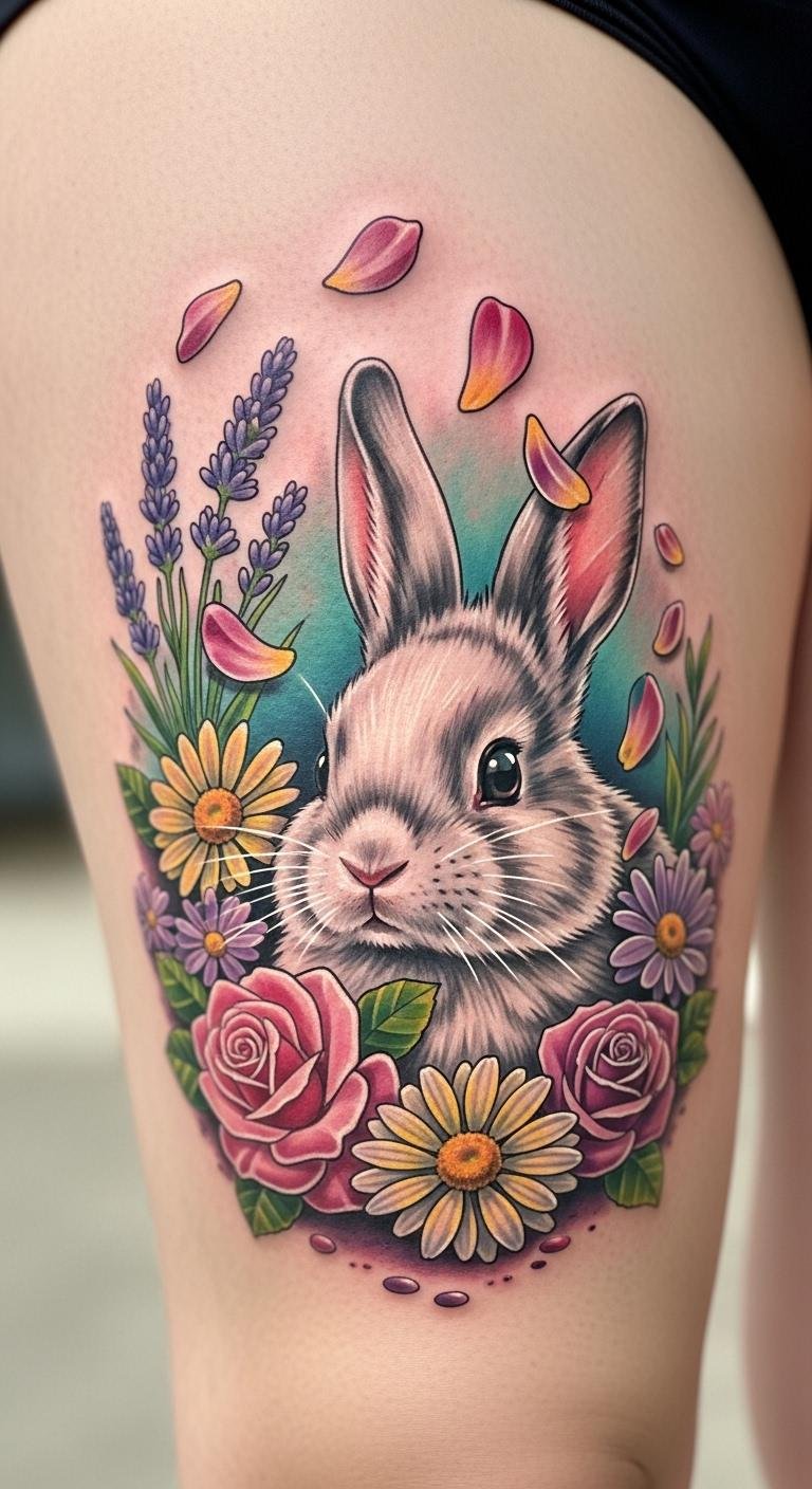 A bunny with flowers tattoo adds a soft, nature vibe. Imagine a rabbit surrounded by blooms like daisies. It’s ideal for nature lovers. Put it on your upper arm for balance. Check artists who offer floral add-ons at budget rates, say under $150. Draw combinations on paper with colored pencils at home. Use garden photos as inspiration for free. This makes personalization cheap. Bunny with flowers looks fresh and feminine. Try fabric markers on clothes first to see how it fits. Keep your design meaningful and fun.