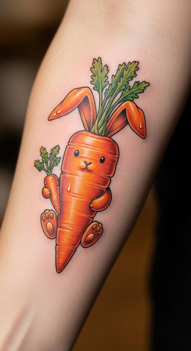 Playful carrot bunny tattoos add humor. Think of a rabbit with a carrot. It’s cheeky and fun. Try your arm. Carrot artists price at $80. Carve carrots at home for designs. Online veggie art helps. Keep it playful. Playful carrot bunny amuses. Use props for mocks. Nibble on ideas.
