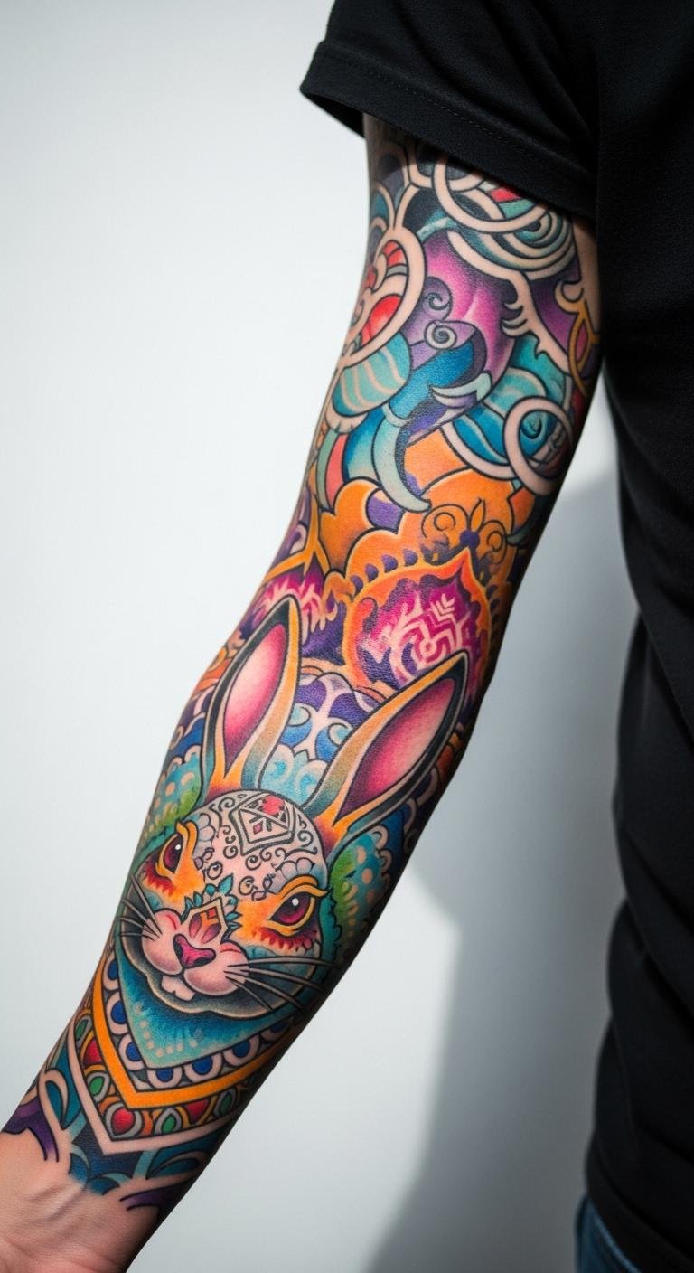 A colorful bunny sleeve makes a bold statement. Envision a full arm with vibrant rabbits and patterns. It’s for the adventurous. Cover your upper arm gradually. Find sleeve specialists with payment plans, starting at $300. Draw sections at home using colored markers. Online communities share free design ideas. Build it step by step. Colorful bunny sleeves pop with energy. Practice with body paint for previews. Keep it exciting and affordable.