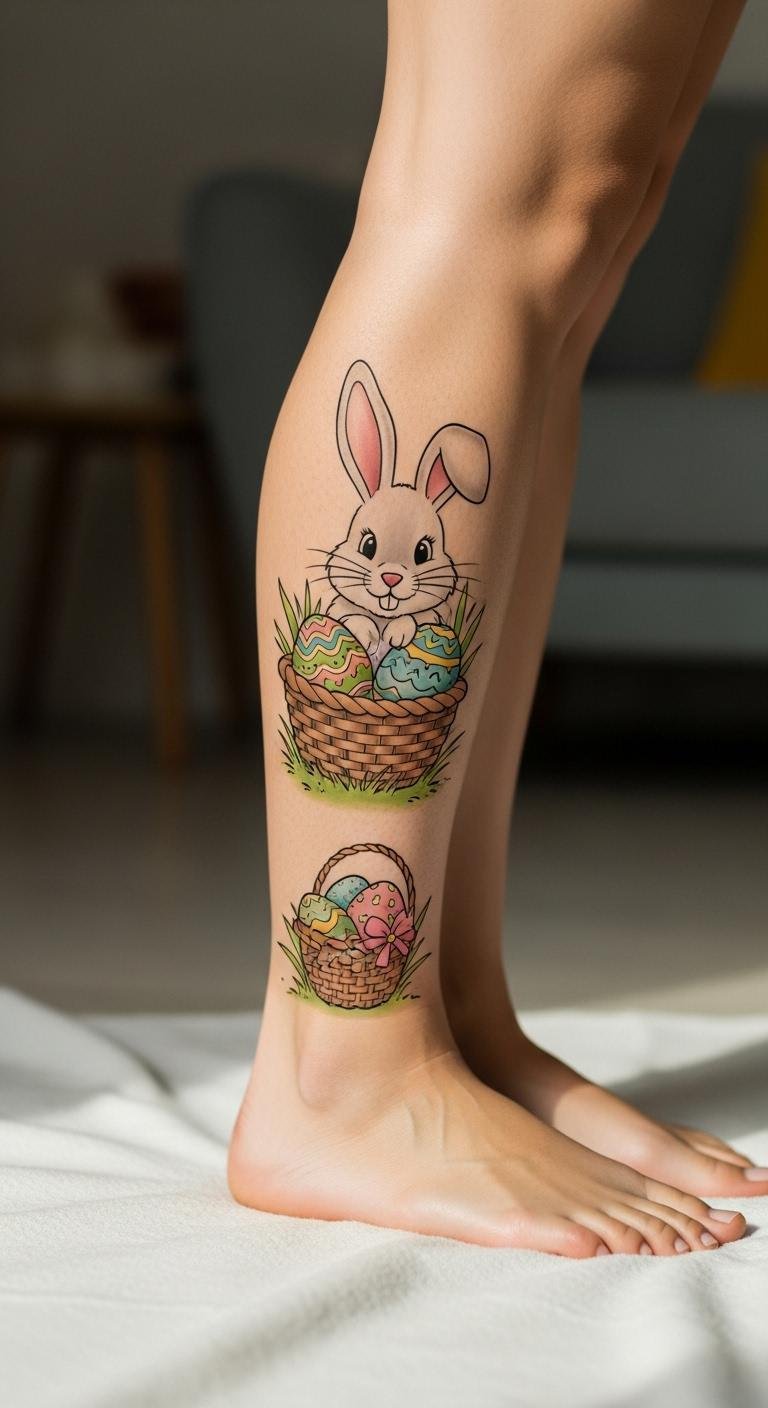 An Easter bunny theme tattoo celebrates holidays. Imagine a rabbit with eggs and baskets. It’s seasonal and fun. Position it on your calf for variety. Seek holiday specials from artists, under $90. Design with seasonal crafts at home, like egg drawings. Free printables online add ideas. Keep it festive. Easter bunny tattoos feel joyful. Try Easter card cutouts for mocks. Enjoy the theme.