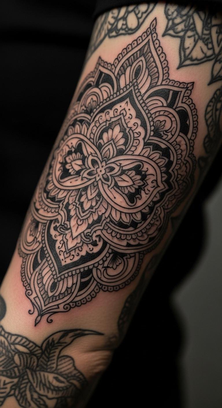 Picture a mandala glowing against dark ink. This design brings calm and mystery to your skin. Start small on your wrist for a test. Use free apps to draw your own version at home. It costs nothing to experiment. Add personal symbols for meaning. Think about placing it where you see it daily. This keeps the vibe fresh. Get inspired by nature photos online. Try sketching with white pencil on black paper first. It’s a budget-friendly way to plan. Focus on balance in your design. Keep lines simple for easy application. You’ll love the high-contrast look. Make it your own with added dots or curves. This tattoo transforms everyday moments.