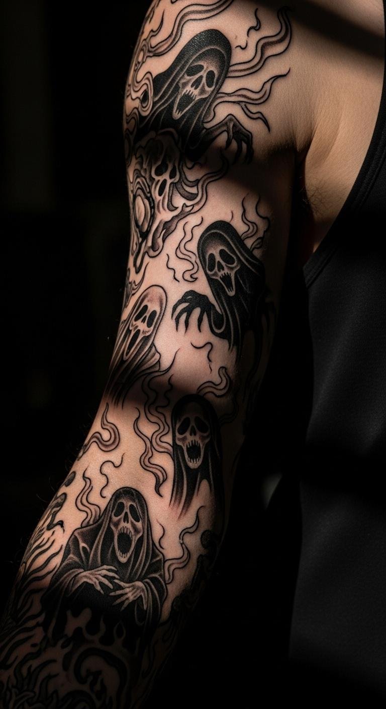 Horror adds thrill. Haunted themes captivate. Sketch spooky elements. Use horror movies for ideas. It’s entertaining. Include dark figures. Place on your arm. Draw with charcoal. This sets the mood. Focus on chills. You’ll embrace fear.