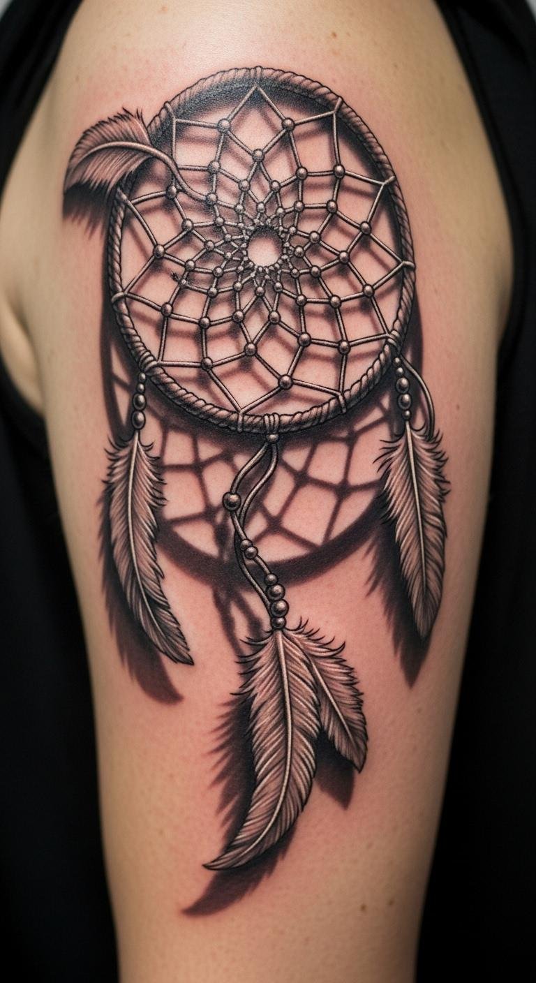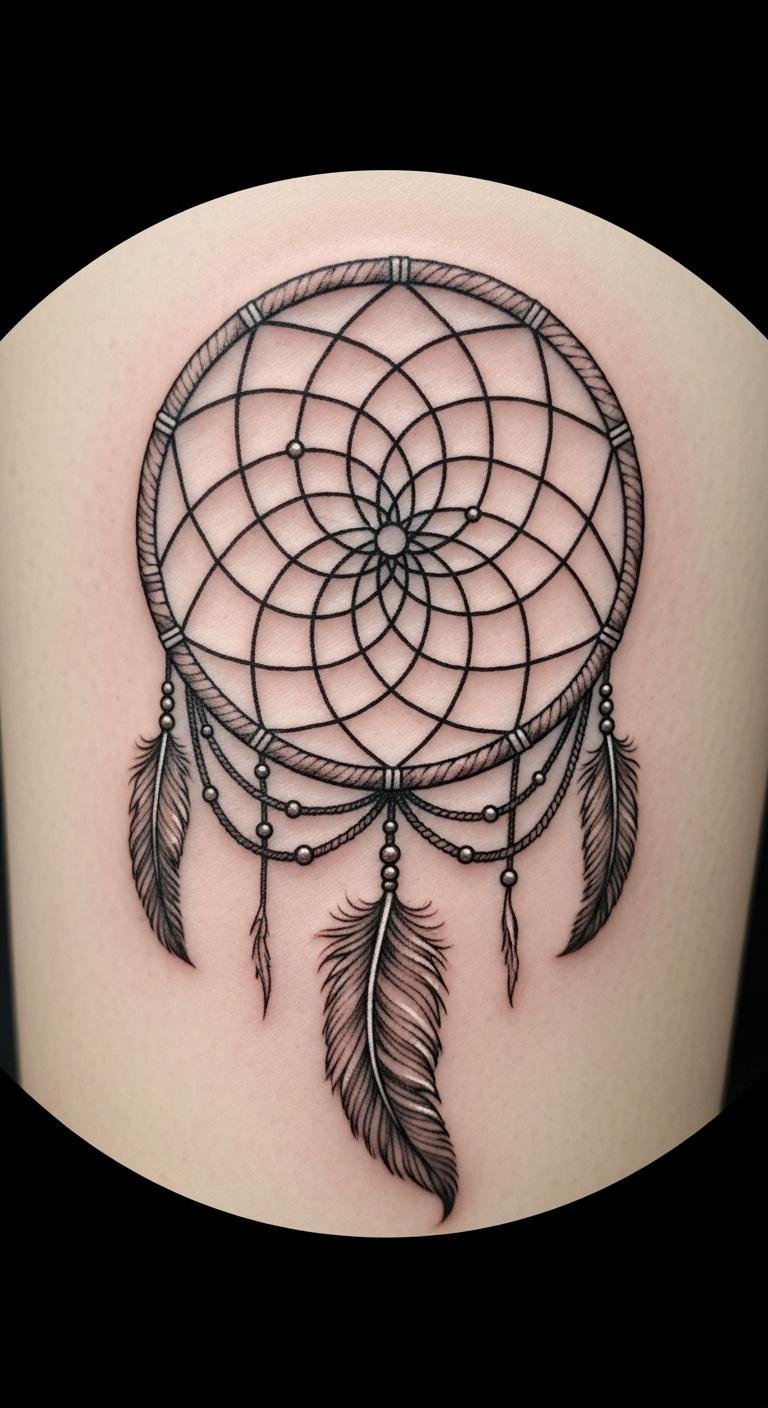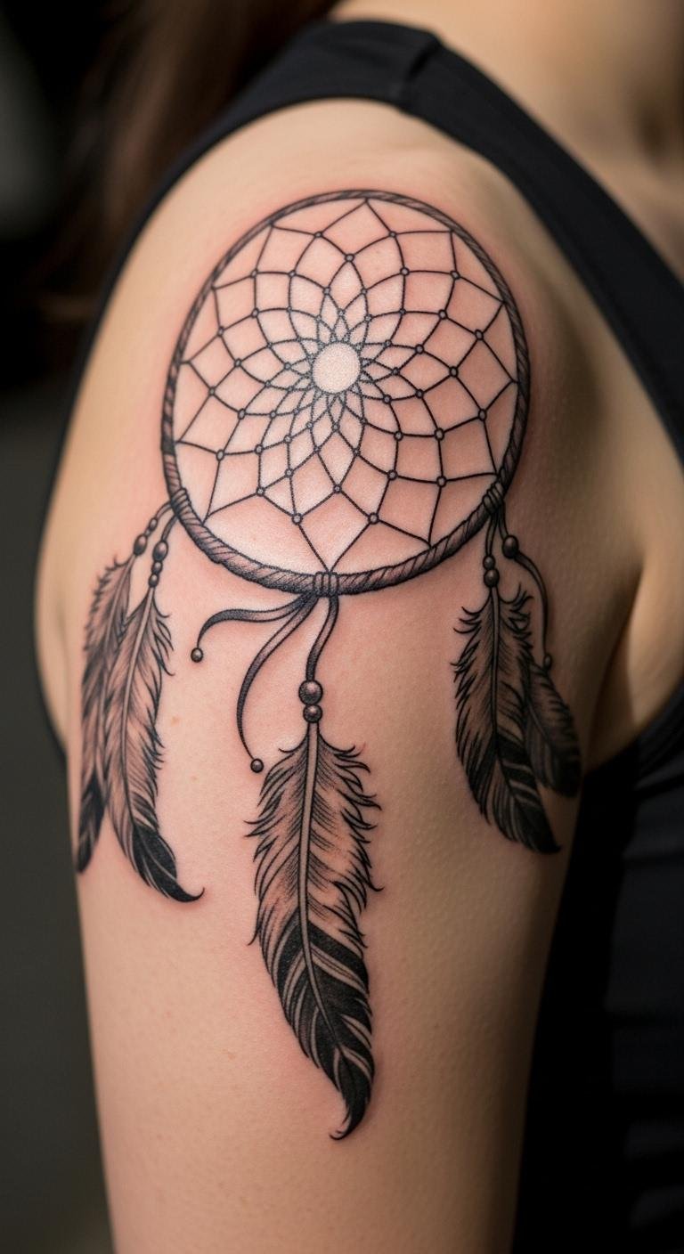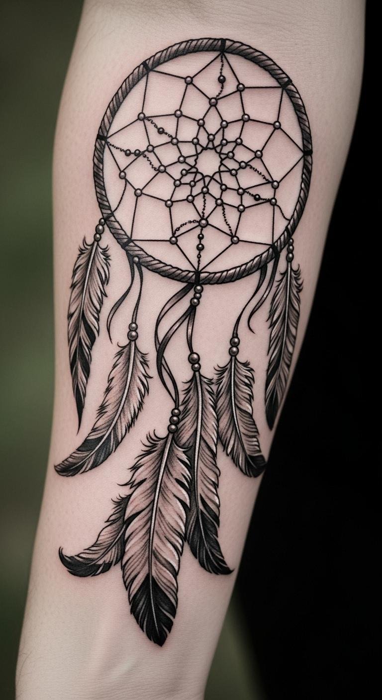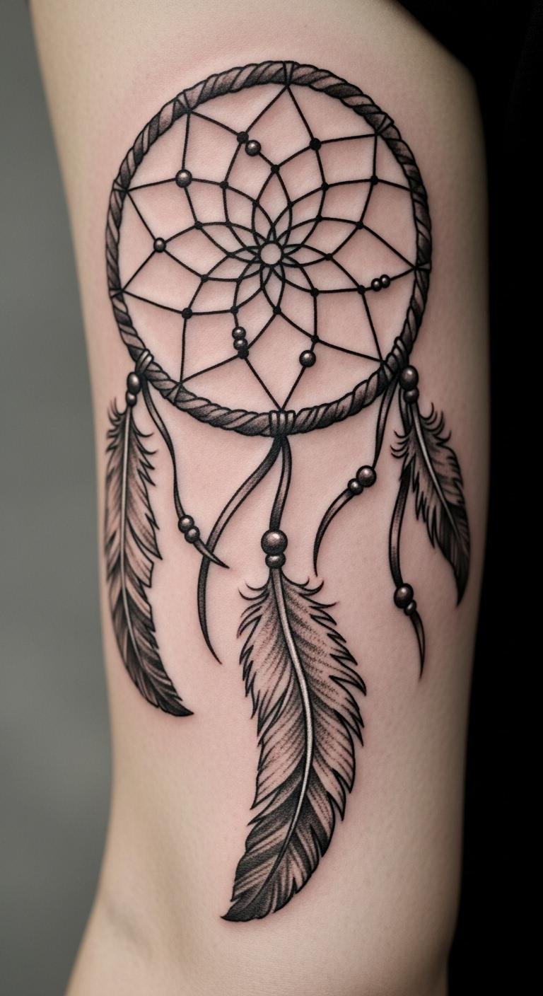 Picture a simple design with feathers dangling from a round web. This style echoes old stories of safety. Feathers sway like whispers from the past. Go for a local artist who uses fine lines. They might charge less than big studios. Sketch your idea on paper first. Add personal touches, like a favorite feather shape. Keep costs down by choosing black ink only. You get protection without extra fuss. Feathers stand for spirit links. Bold choice: Pair it with beads for extra meaning. Try drawing it yourself as practice. Find inspiration in nature walks. This tattoo reminds you of calm days ahead.