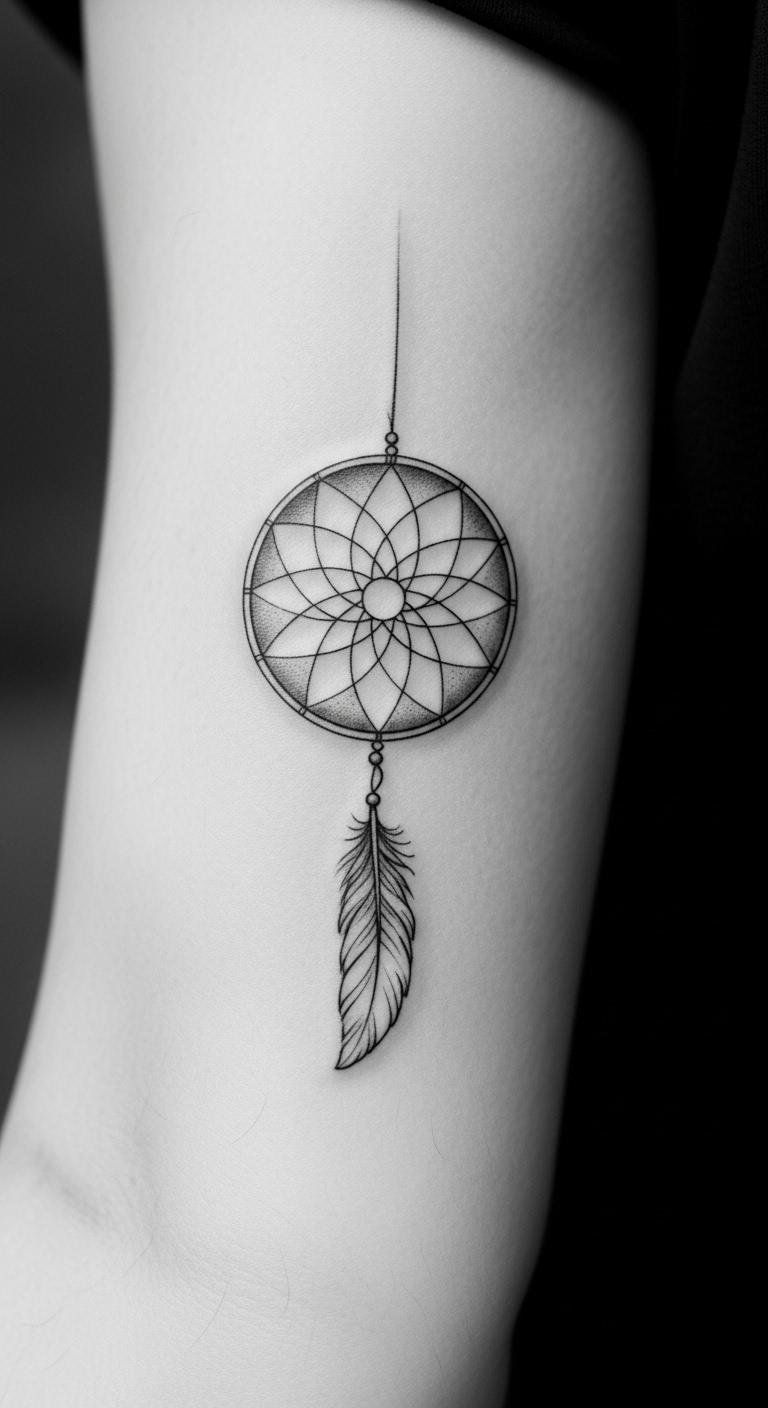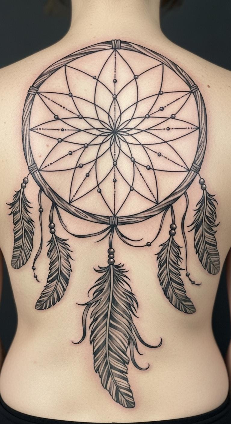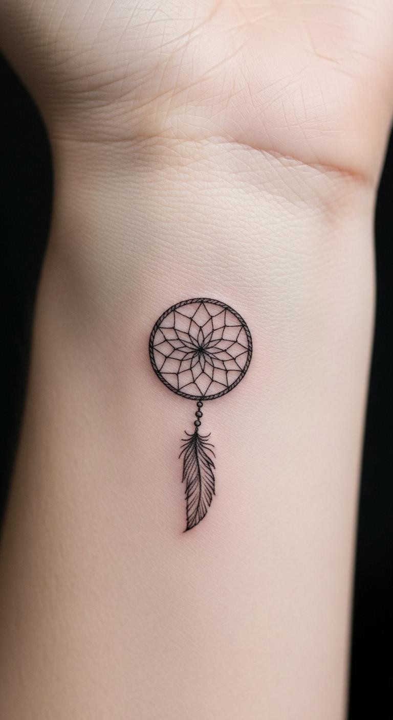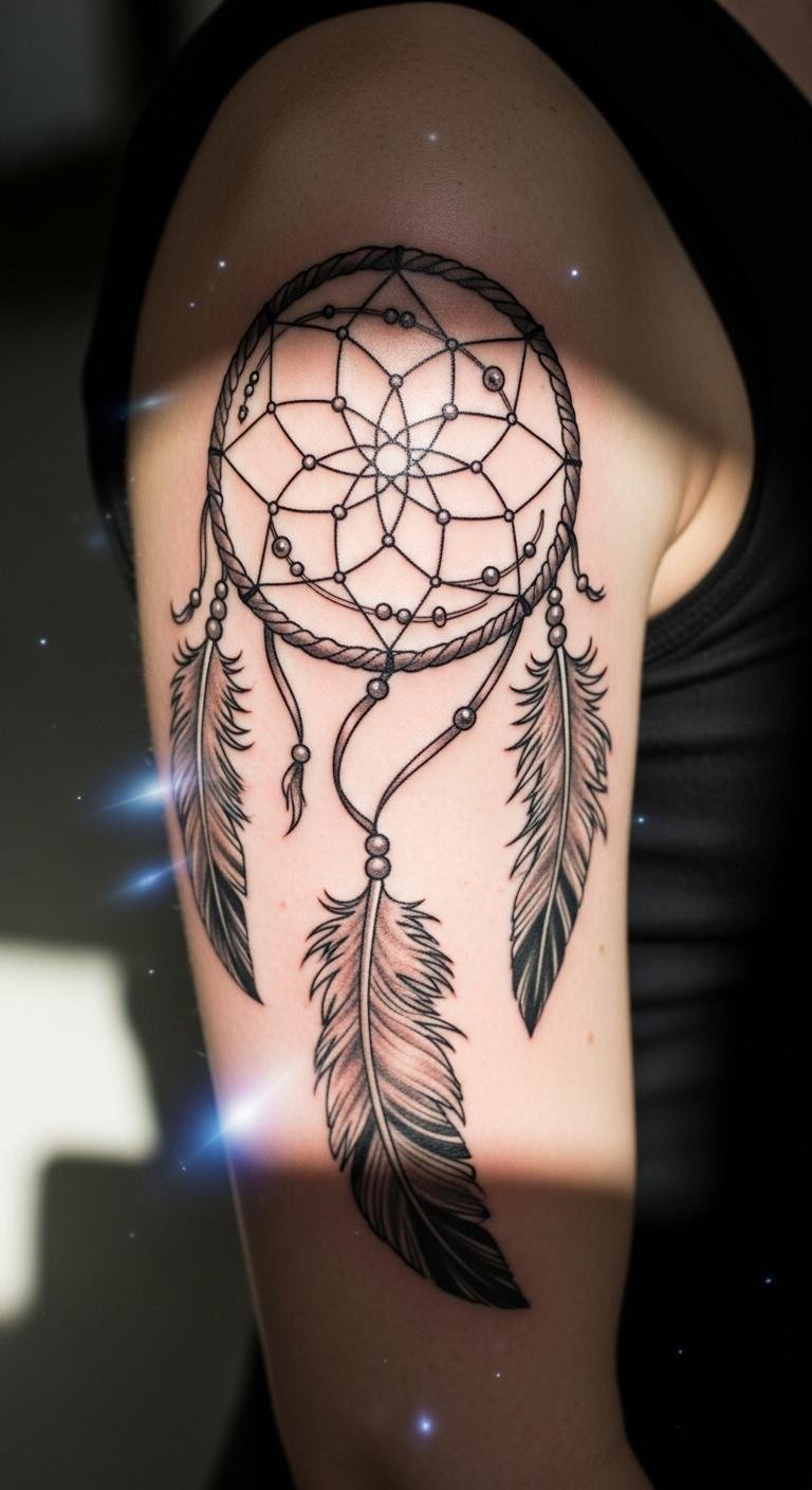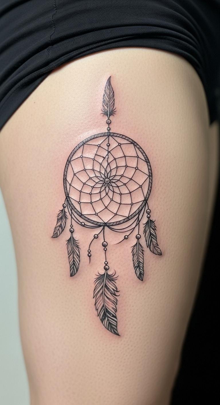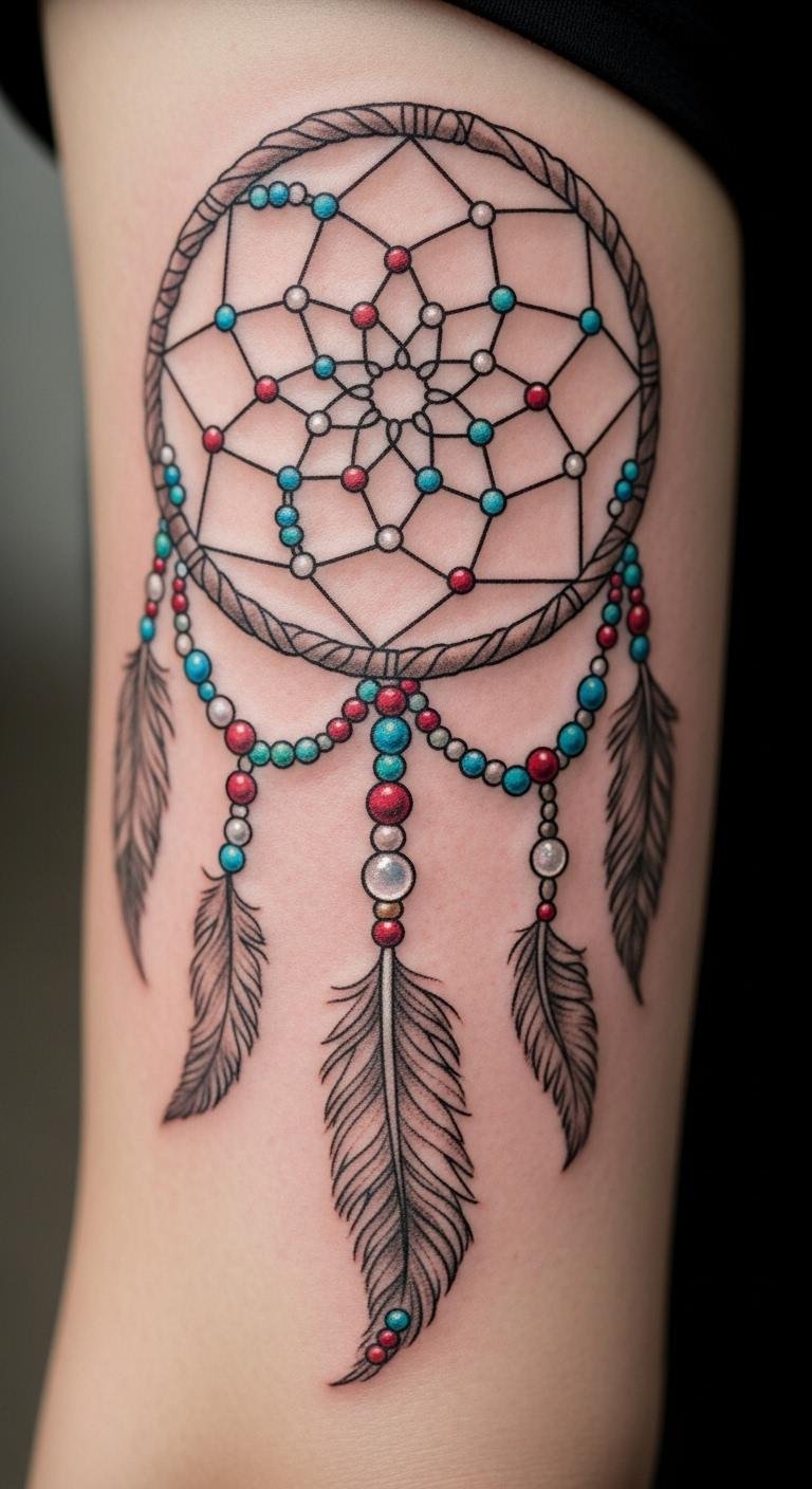 Picture a simple design with feathers dangling from a round web. This style echoes old stories of safety. Feathers sway like whispers from the past. Go for a local artist who uses fine lines. They might charge less than big studios. Sketch your idea on paper first. Add personal touches, like a favorite feather shape. Keep costs down by choosing black ink only. You get protection without extra fuss. Feathers stand for spirit links. Bold choice: Pair it with beads for extra meaning. Try drawing it yourself as practice. Find inspiration in nature walks. This tattoo reminds you of calm days ahead.