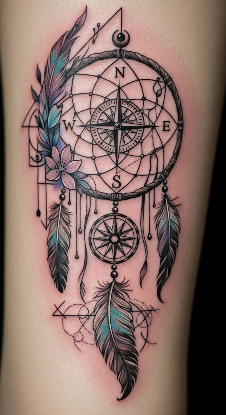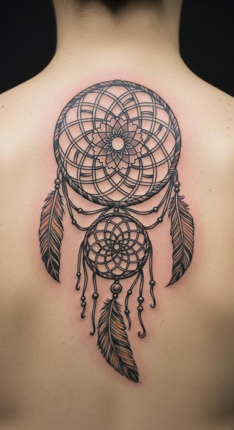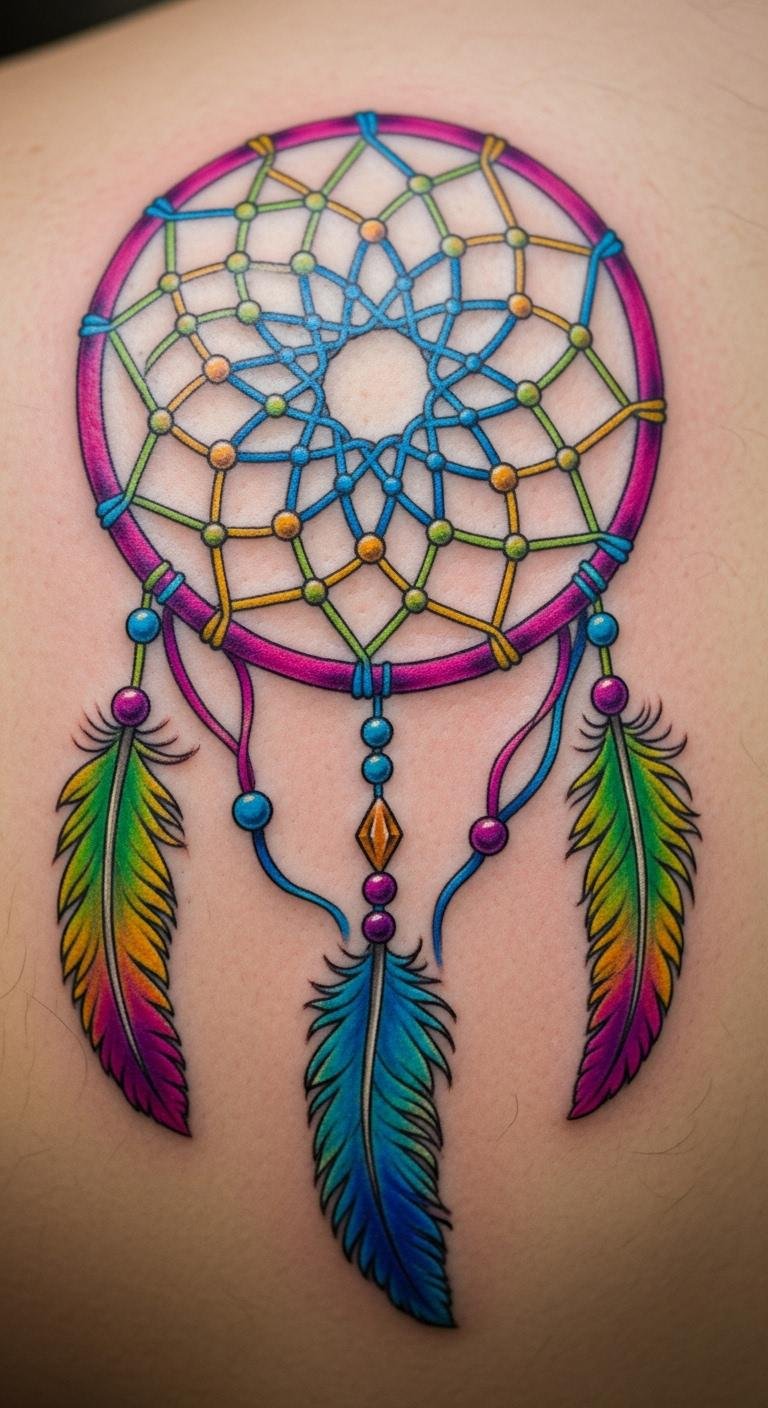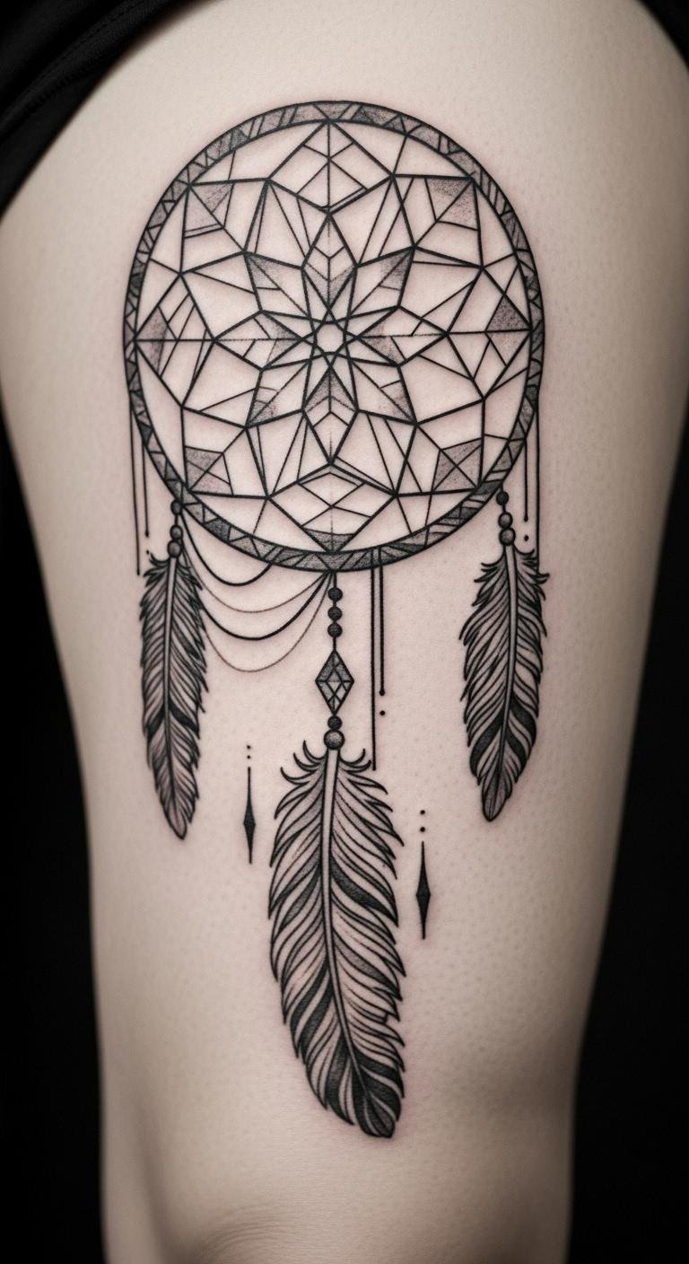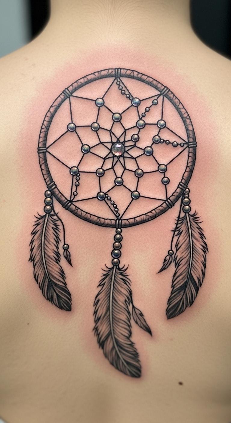Picture a simple design with feathers dangling from a round web. This style echoes old stories of safety. Feathers sway like whispers from the past. Go for a local artist who uses fine lines. They might charge less than big studios. Sketch your idea on paper first. Add personal touches, like a favorite feather shape. Keep costs down by choosing black ink only. You get protection without extra fuss. Feathers stand for spirit links. Bold choice: Pair it with beads for extra meaning. Try drawing it yourself as practice. Find inspiration in nature walks. This tattoo reminds you of calm days ahead.