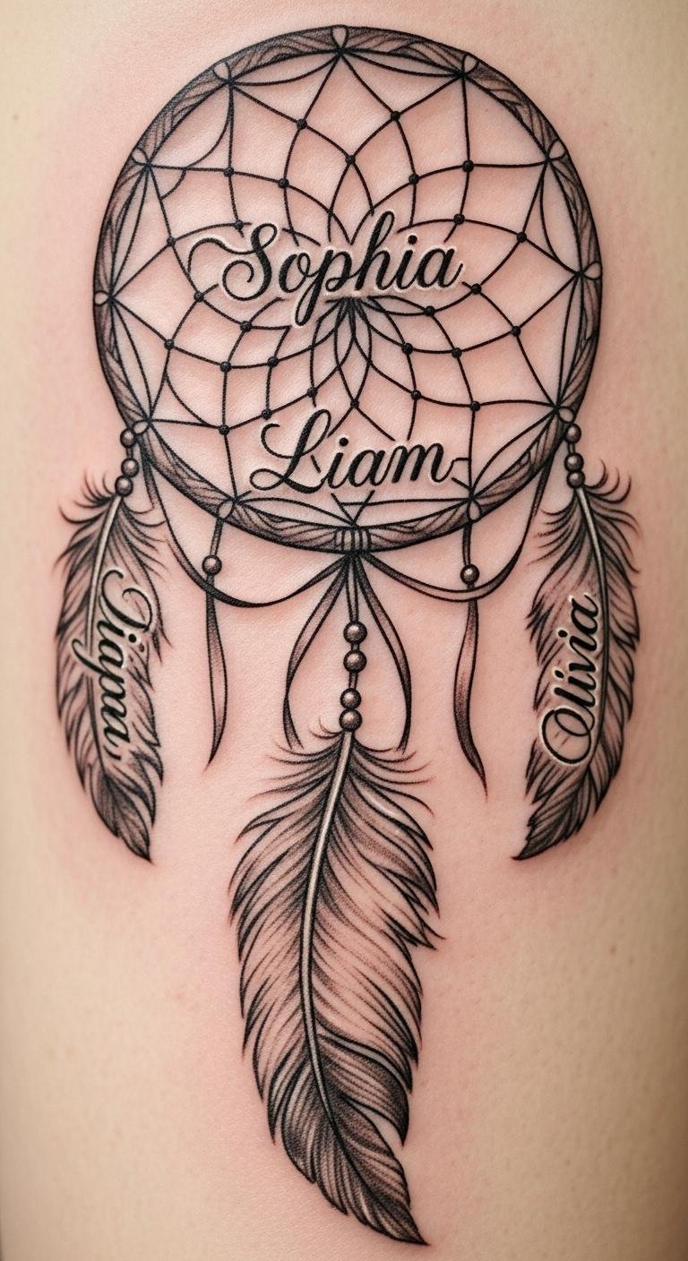 Add names to the web for family ties. It turns protection personal. Feathers guard those you love. Choose a simple font to cut costs. An artist can add it quickly. Write names on a template first. Print from your computer. This tattoo honors connections. Practical move: Use initials for affordability. It keeps the design focused.