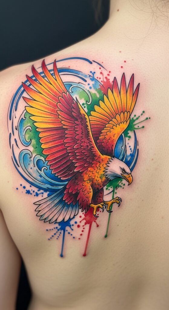 Go for a watercolor eagle that adds color and flow to your back. It gives a painted effect with soft hues. This idea brings art to life without heavy lines. Use watercolors from a dollar store to test designs on paper first. Draw the eagle outline and blend colors yourself for fun. Pair it with simple elements like a sun for extra flair. Save money by avoiding complex shades early on. Ask friends for design feedback over coffee. The result feels fresh and personal. Try this at home with basic brushes and paper. You’ll create a tattoo that pops with ease.