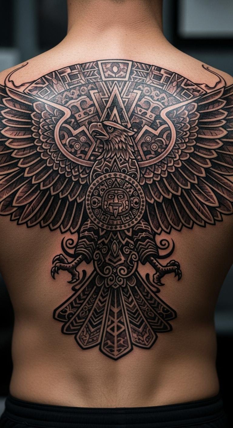 Draw from Aztec themes for your eagle back tattoo. It incorporates ancient patterns for depth. This design adds cultural flair. Look up free Aztec images and trace them on paper. Combine with the eagle using basic tools. Keep symbols straightforward. This approach is easy on the wallet. Share with cultural groups. The tattoo enriches your story. Experiment with prints at home. You’ll weave in history.
