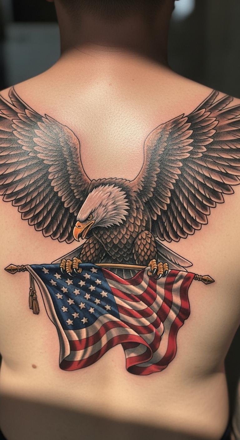 Mix an eagle with flags on your back for a patriotic vibe. It highlights freedom in every detail. Place the flag in the eagle’s talons for impact. Use old magazines to cut out flag shapes and glue them for mock-ups. Draw the eagle around it with pencils you already own. This keeps things affordable and fun. Show your design to buddies for quick input. The final tattoo speaks volumes. Test ideas on paper at your desk. You’ll get a design that inspires.