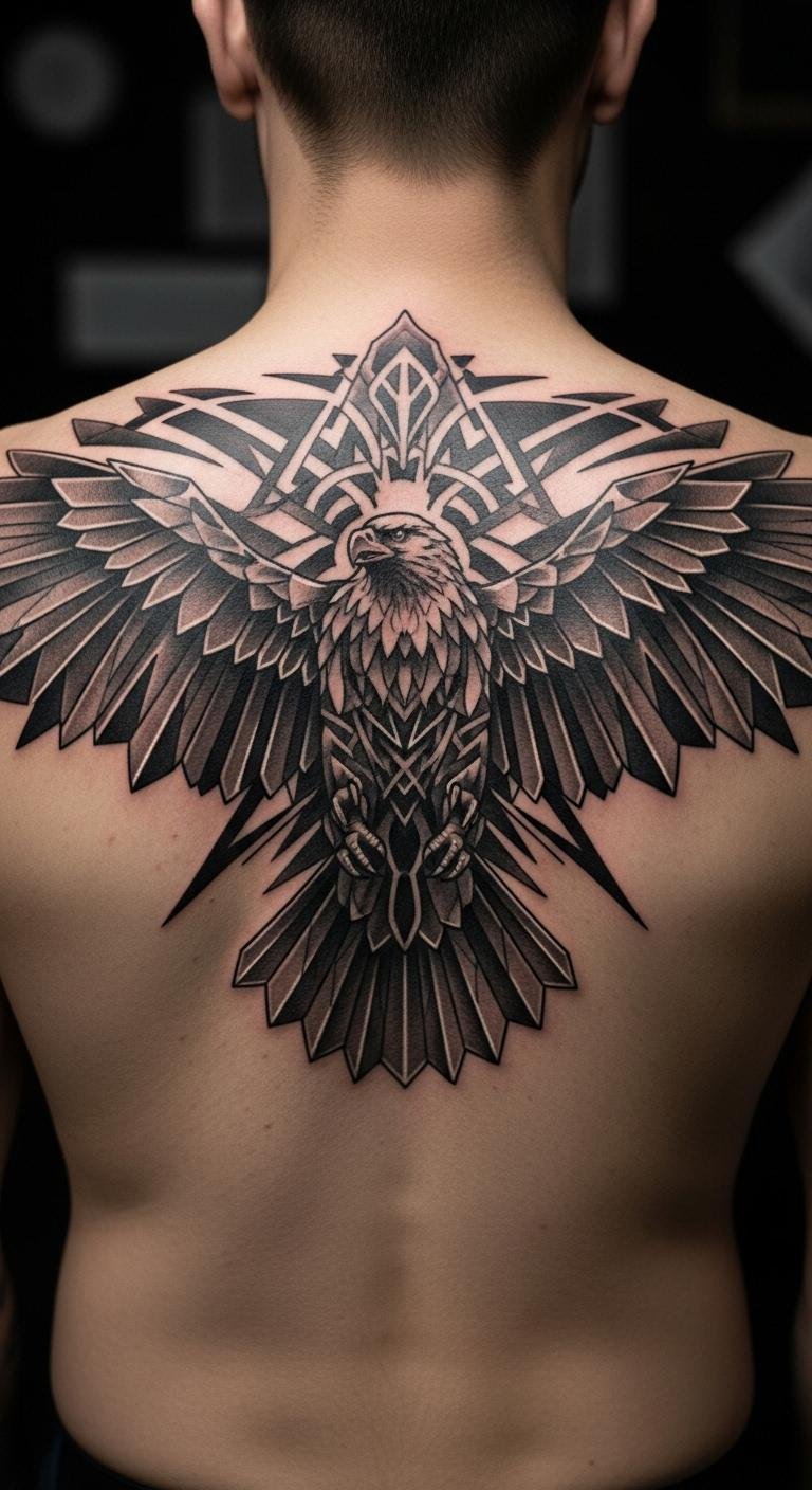 Try a geometric eagle to modernize your back. It uses shapes for a clean, edgy feel. This style fits well with your body’s lines. Grab graph paper and a ruler to sketch patterns yourself. Connect dots to form the eagle’s form at no extra cost. Add stars for a personal spin. Keep designs basic to save on artist time. Discuss with pals over a meal. The tattoo looks sleek and timeless. Practice with household items like string. You’ll craft something unique easily.