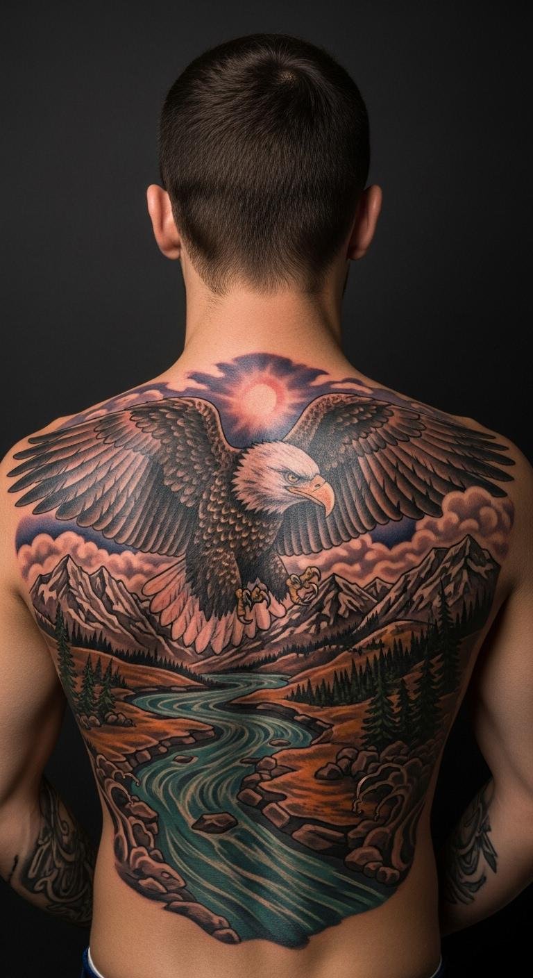 Place an eagle among mountains and rivers on your back. It connects to nature in a big way. This design makes your tattoo feel alive. Use leaves from your yard to trace natural shapes on paper. Draw the eagle soaring above with simple crayons. Mix in trees for depth without fuss. This approach cuts down on expensive additions. Get ideas from hikes in your area. The result ties into your outdoor life. Experiment at home with found objects. You’ll create a balanced piece.