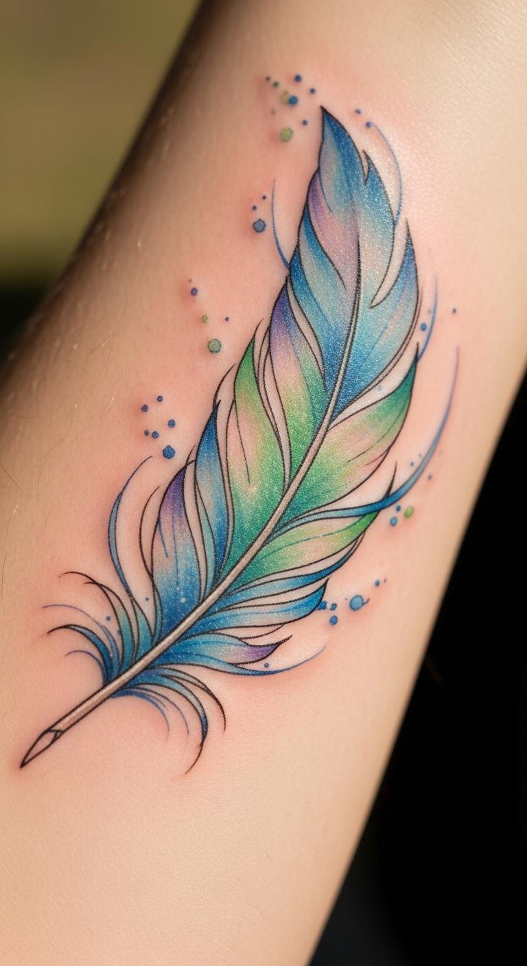 Watercolor feathers bring a splash of color to your skin. Think soft blues and greens that mimic a bird in flight. This style adds a fun, artistic vibe without overwhelming your look. Start with a basic sketch on paper using colored pencils. It costs under $5 and lets you test ideas at home. Pick a small spot like your wrist for less pain. Bold the key: watercolor feather stands out for its ease. Mix in personal touches, like a date, with free apps for digital mockups. Keep it simple—avoid complex shades at first. This approach saves money and helps you decide fast. Grab inspiration from online galleries, but adapt to your budget. Try drawing your own version on paper before booking. It’s a quick way to feel confident. Feathers in this style flow naturally, inspiring freedom every day.