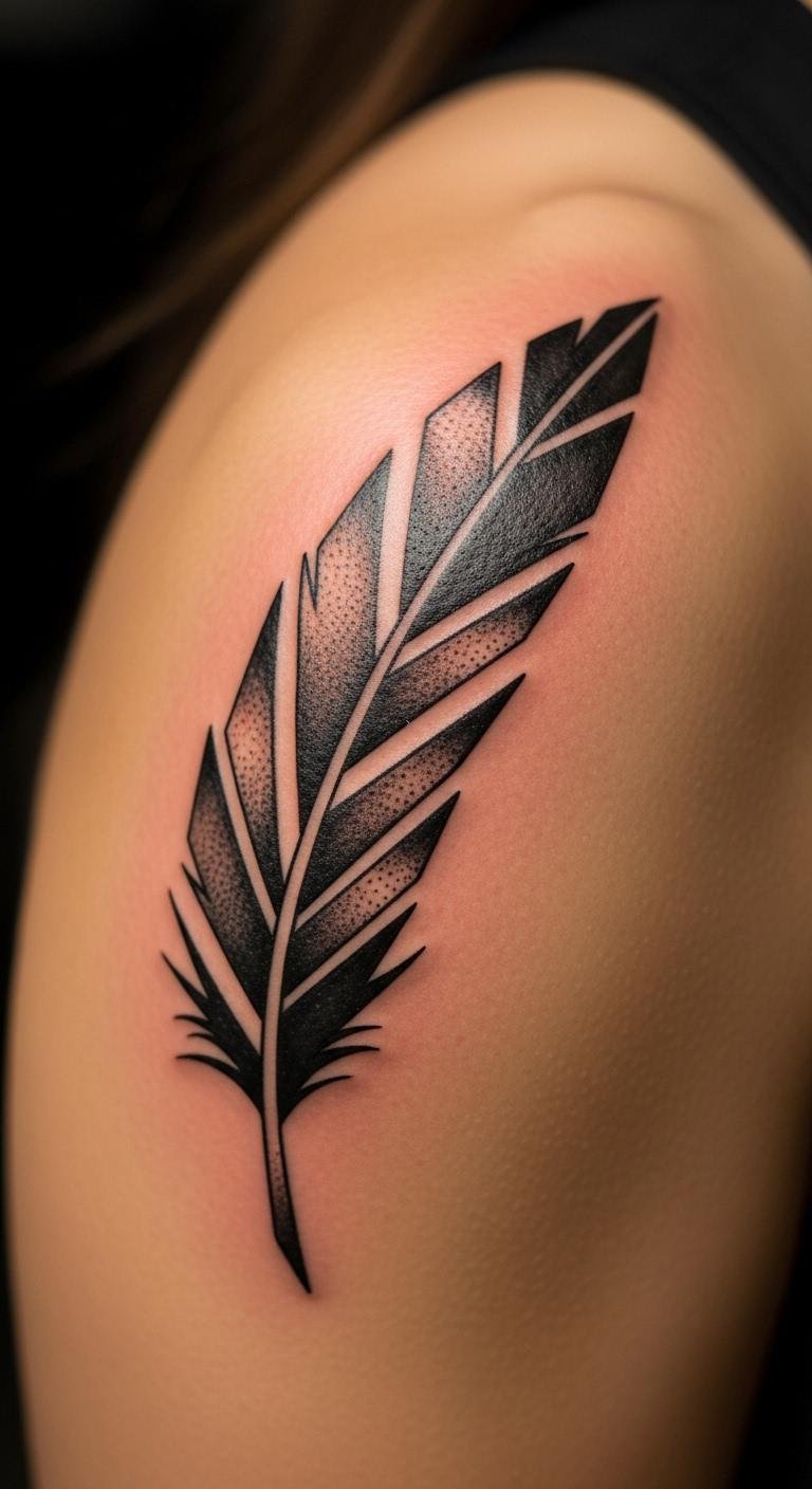Geometric feathers mix shapes for modern freedom. Draw squares and lines around the feather on paper for under $2. Keep angles sharp for a cool look. Try your shoulder for balance. This idea builds structure with flair. Bold this: geometric feather modernizes ink smartly. Use rulers at home to plan. Stick to basics for budget sessions. Maintain with simple lotions. Feathers in this style stand out, sparking creativity. Practice on paper first. This way, you innovate without extra spend.