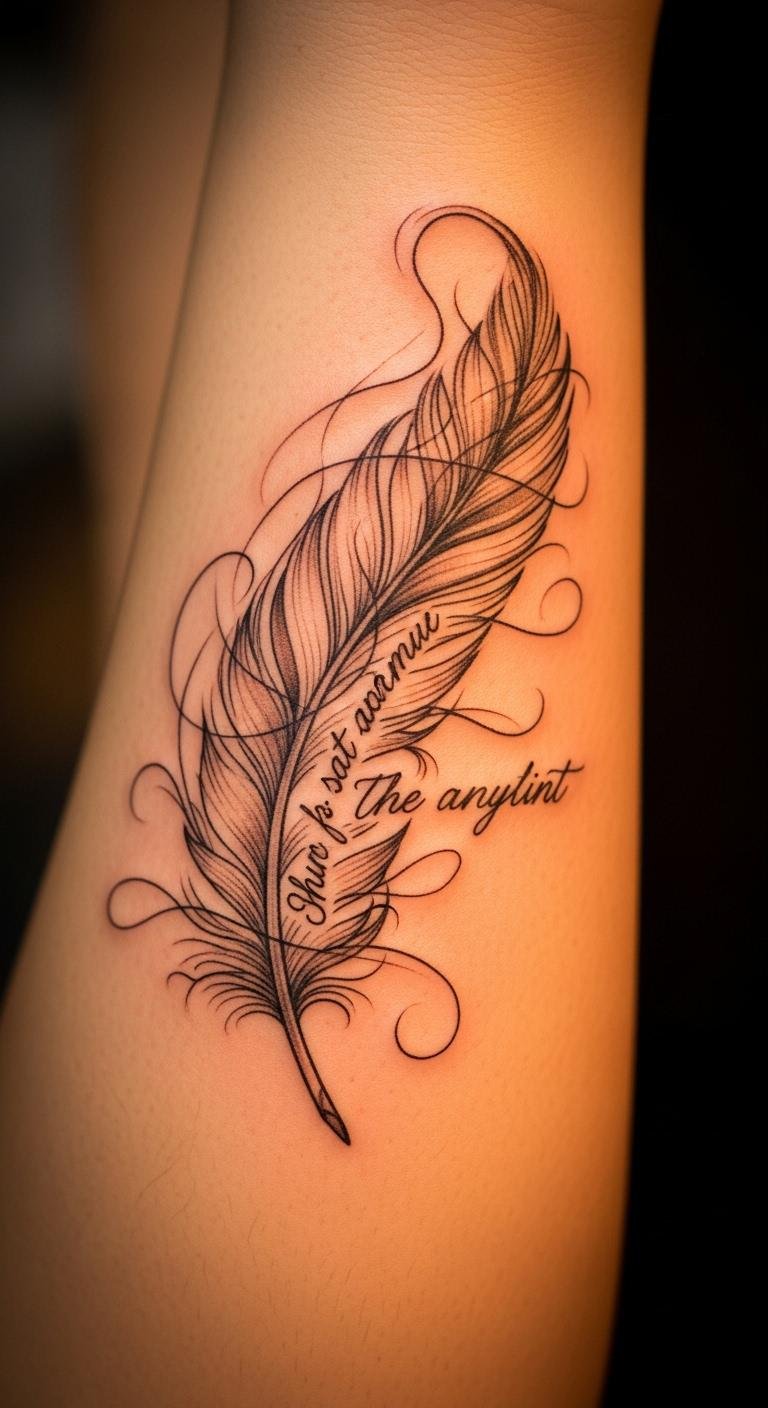 Feathers with quotes add words to your flight. Write a short phrase and feather on paper—use a pen for free. Choose uplifting words like “fly high.” Put it on your forearm for motivation. This combo speaks freedom directly. Bold this: feather with quote personalizes deeply. Jot ideas with household items. Keep text simple to save on ink. Care for it routinely. Feathers here carry messages, driving action. Sketch on paper before ink. This method makes statements affordable.