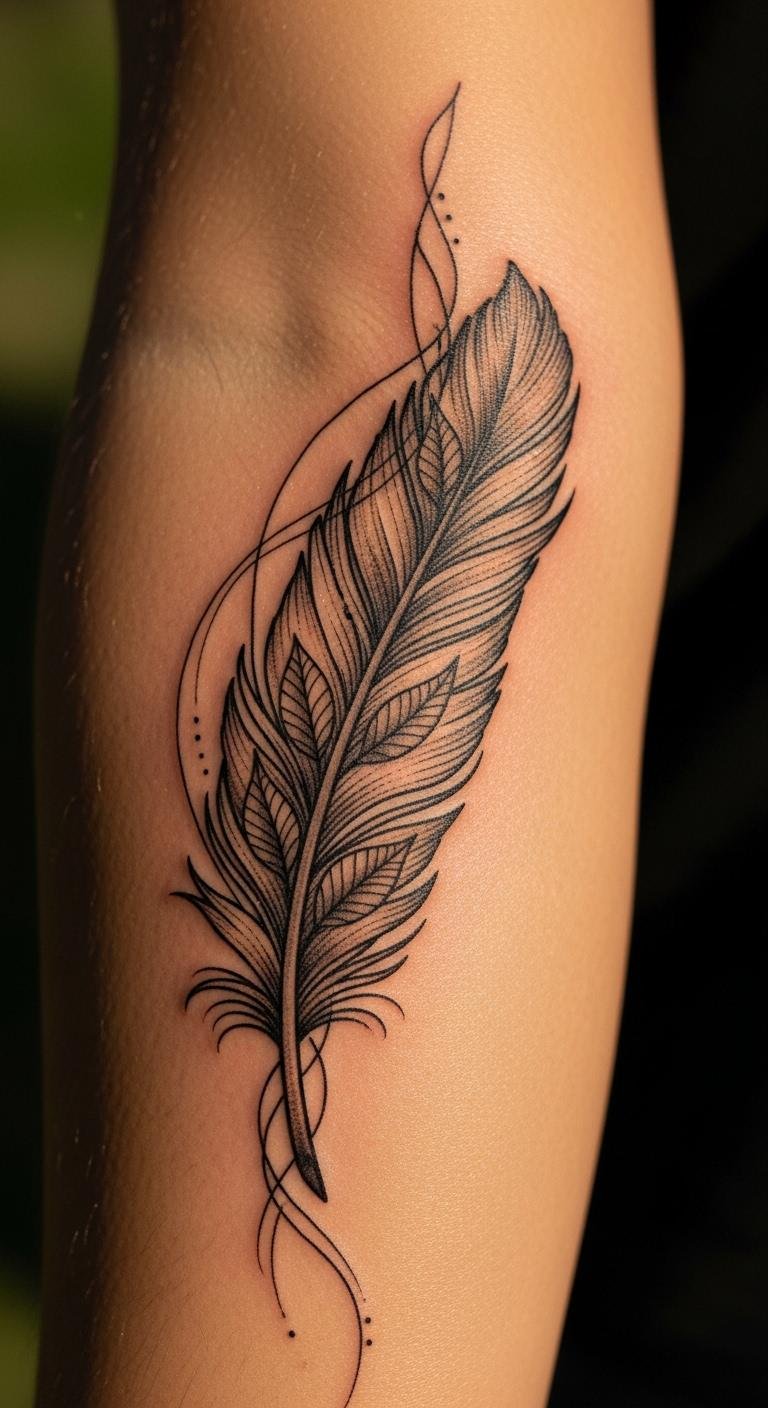 Abstract feathers turn ink into artful freedom. Sketch swirls on paper with paints—costs little and sparks ideas. Focus on free-form shapes. Place it on your thigh for expression. This design explores creativity without rules. Bold the phrase: abstract feather frees your vision. Experiment with scraps at home. Keep it loose for affordable fun. Protect with daily basics. Feathers here dance wildly, inspiring imagination. Draw variations on paper to start. This approach makes art personal and easy.