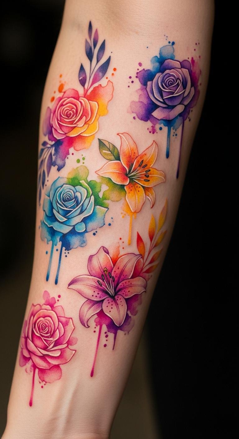 Vibrant watercolor flowers brighten your forearm. Draw blended petals on paper. This DIY is straightforward. Budget tattoos start at $95. Use few hues. Fit to your arm. Personalize via sketches. Pair with clothes. Schedule wisely. Plan with art.