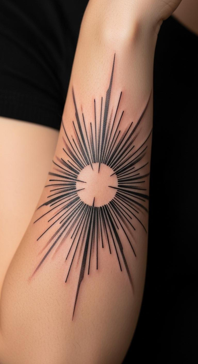 An abstract sunburst energizes. Sketch rays on paper. DIY ease. Tattoos for $85. Radiant style. Arm fit. Tweak drawings. Confidence wear. Session timing. Art guidance.