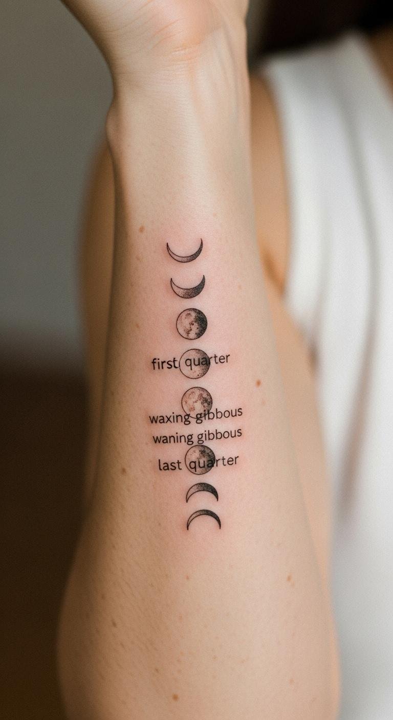 A minimalist moon phase cycles. Draw phases on paper. Easy. Options at $65. Sequential style. Arm spot. Add elements. Confidence build. Book time. Art reference.