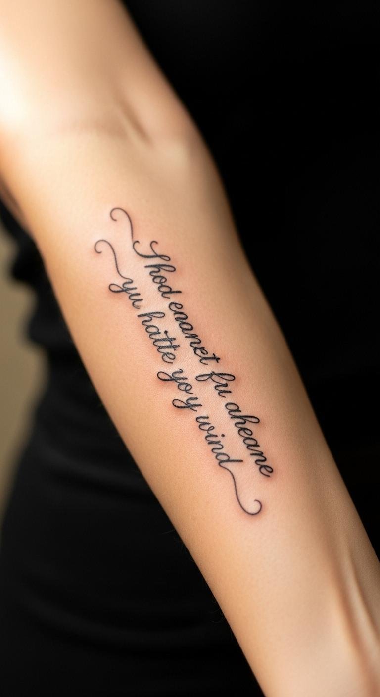 A script quote on your forearm can speak volumes. Write your favorite phrase on paper with a marker to see how it flows. This DIY trick costs zero and helps refine words. Search for artists who do text work cheaply—options start at $60. Pick a basic font to keep it affordable. Place it along the inner arm for discreet wear. Customize by adding a small symbol you draw yourself. Wear under long sleeves for professional settings. This idea fits quick appointments, often available mid-week. Use your sketch to discuss changes and lower fees. Focus on quotes that resonate to make it meaningful.