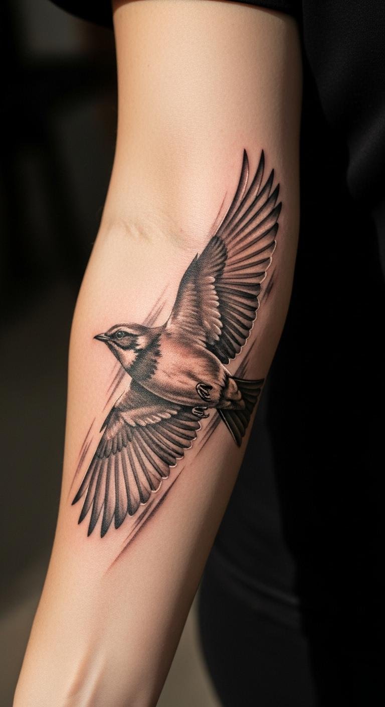 Try a realistic bird tattoo on your forearm for a natural touch. Draw a simple bird shape at home with a pencil for practice. This easy step ensures you like the look without spending. Look for artists who offer realistic styles at $100 or less. Go with grayscale to save on color. Put it on the forearm’s side for balanced visibility. Add a tiny detail from your drawing to personalize. Style with casual wear to enhance your routine. Book shorter sessions to fit your schedule and budget. Use your sketch as a reference to guide talks with the artist.