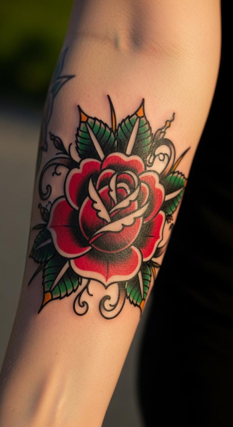 A traditional rose on your forearm brings timeless appeal. Sketch a rose with bold strokes on paper first. This at-home practice keeps things free. Seek artists who do classic designs for $90. Use fewer colors to cut expenses. Place it where it suits your arm’s shape. Add a twist from your drawing for uniqueness. Wear with versatile outfits for confidence. Schedule affordable sessions in advance. Let your sketch inform choices to avoid extras.